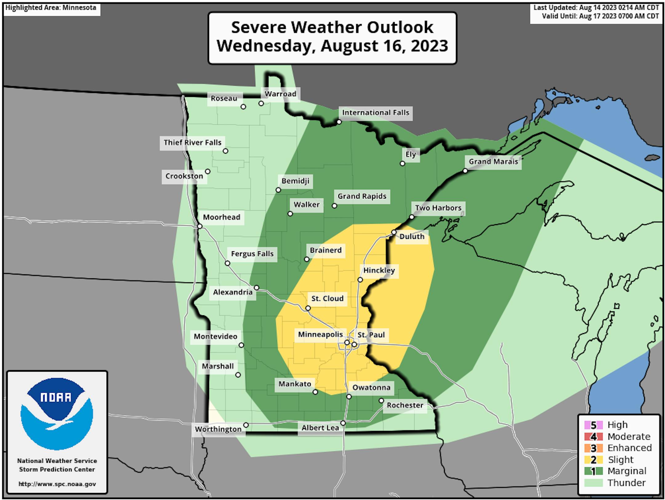 As mentioned, a few storms could be strong to severe Wednesday into Wednesday Night as the cold front approaches and moves through. A Slight Risk of severe weather (threat level 2/5) is in place across eastern Minnesota into western Wisconsin, including the Twin Cities, St. Cloud, and Duluth. I would expect hail and wind to be the primary threats.