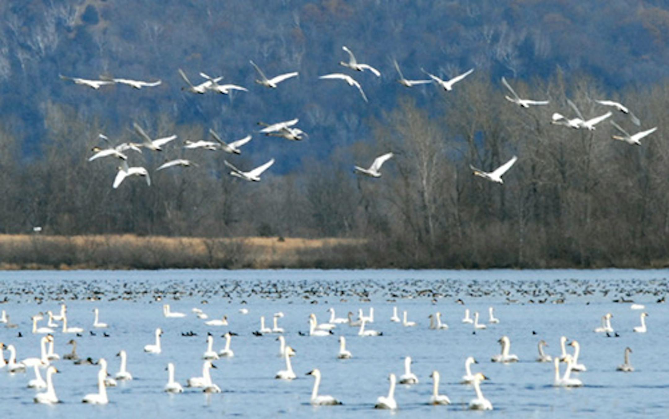 Tundra Swans have arrived on the Mississippi River near Brownsville in southeastern Minnesota. This is an annual refueling spot as the birds migrate from nesting territory in northern Canada to wintering grounds on Chesapeake Bay in Maryland.