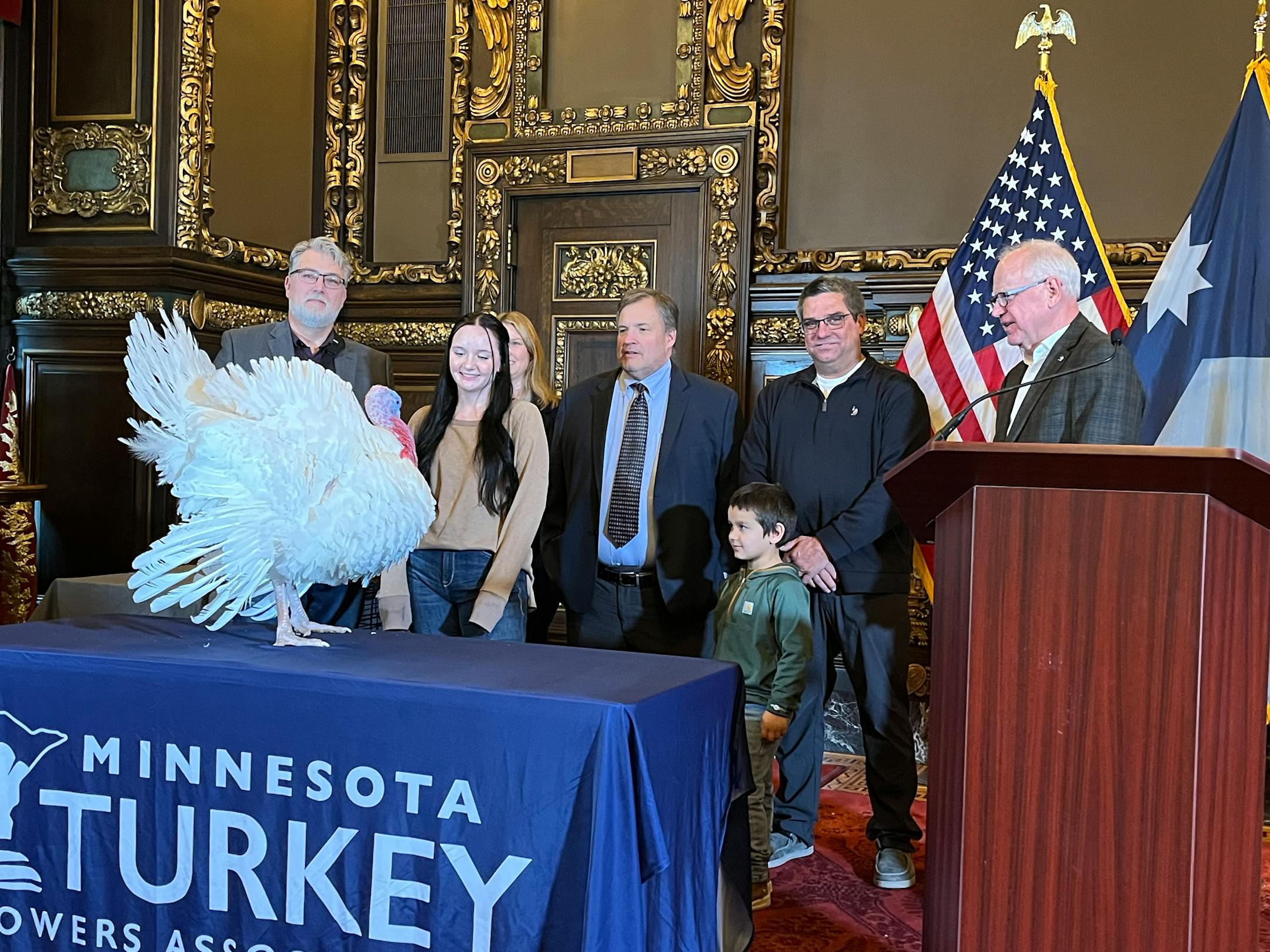The governor was flanked by representatives of the Minnesota Turkey Growers Association, including 16-year-old Shelby Barber, who spent the past 20 weeks raising Gru and getting him camera- and apparently dinner-ready.