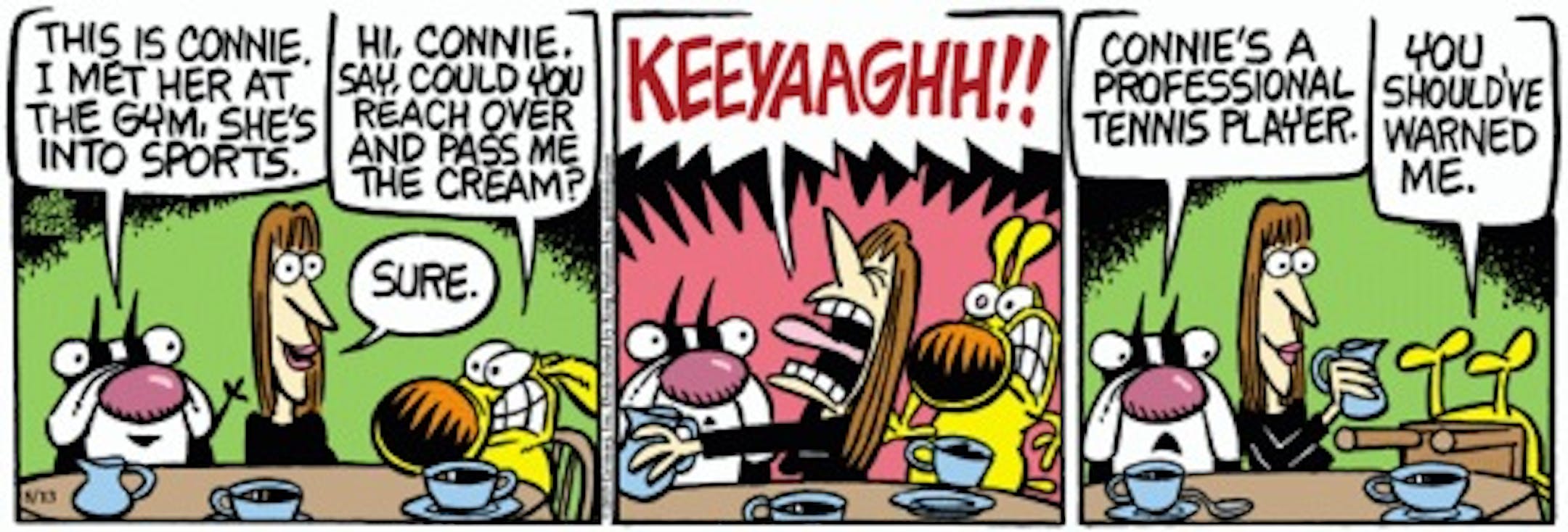 Leaving aside the fact that the dog goes to a gym to hook up with vacant-eyed humans, and ignoring for a moment the fact that the tennis player cannot pass the cream without channelling the ferocity she brings to her profession, and allowing for the peculiar wording of Grimm's request for her to "reach over" to get the cream, wouldn't you use "pass" if she was a football player?