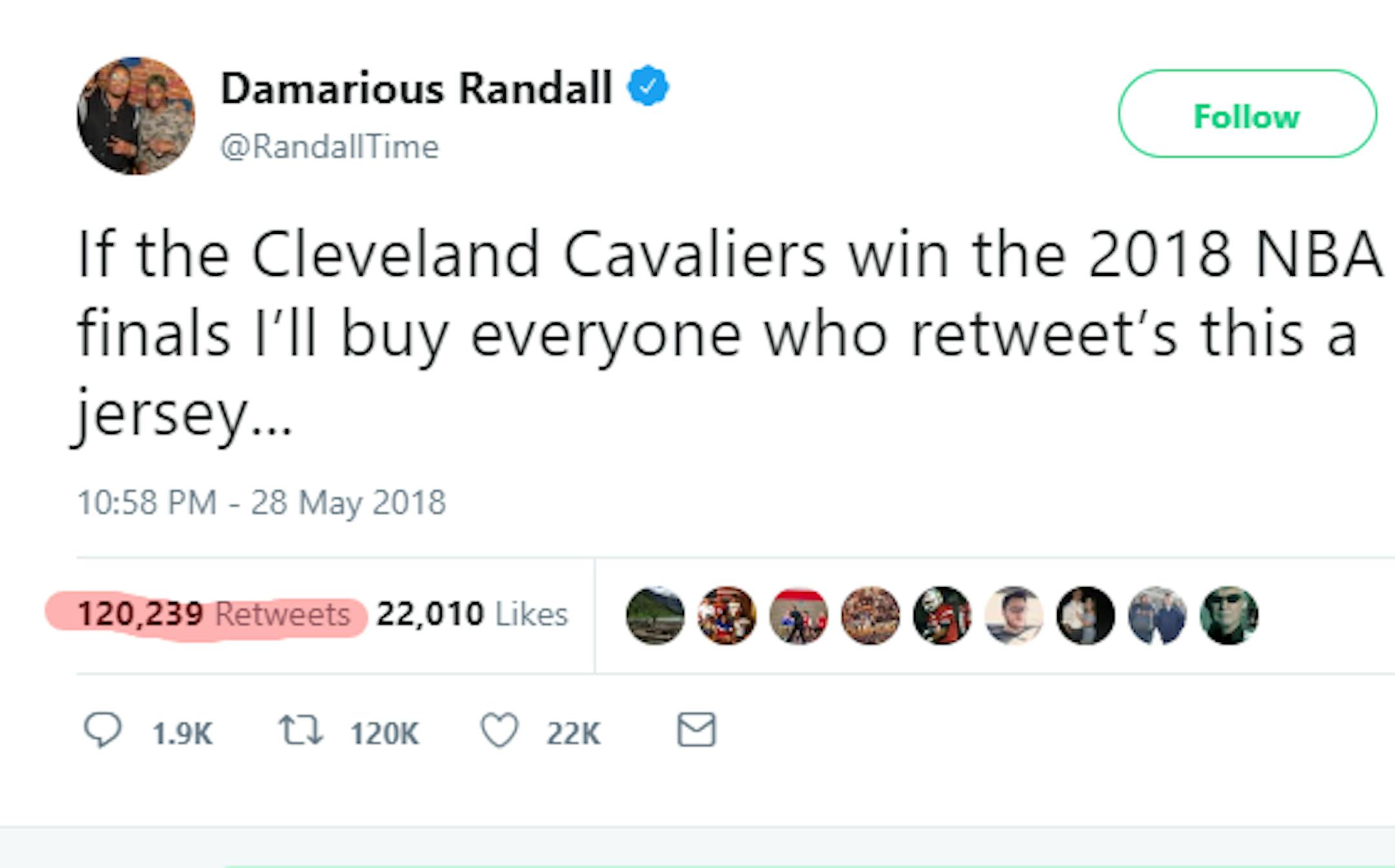 So, yeah, he was probably expecting a little action. He probably wasn't expecting 120,000 retweets (and rising rapidly). Assuming he's talking about an NFL Browns jersey, those go for $99.99. So as of now, he's on the hook for $12 million worth of jerseys. (Maybe it's a fitting punishment for putting an apostrophe in "retweets." If that's the only way someone can learn that plural is not the same as possessive, so be it).