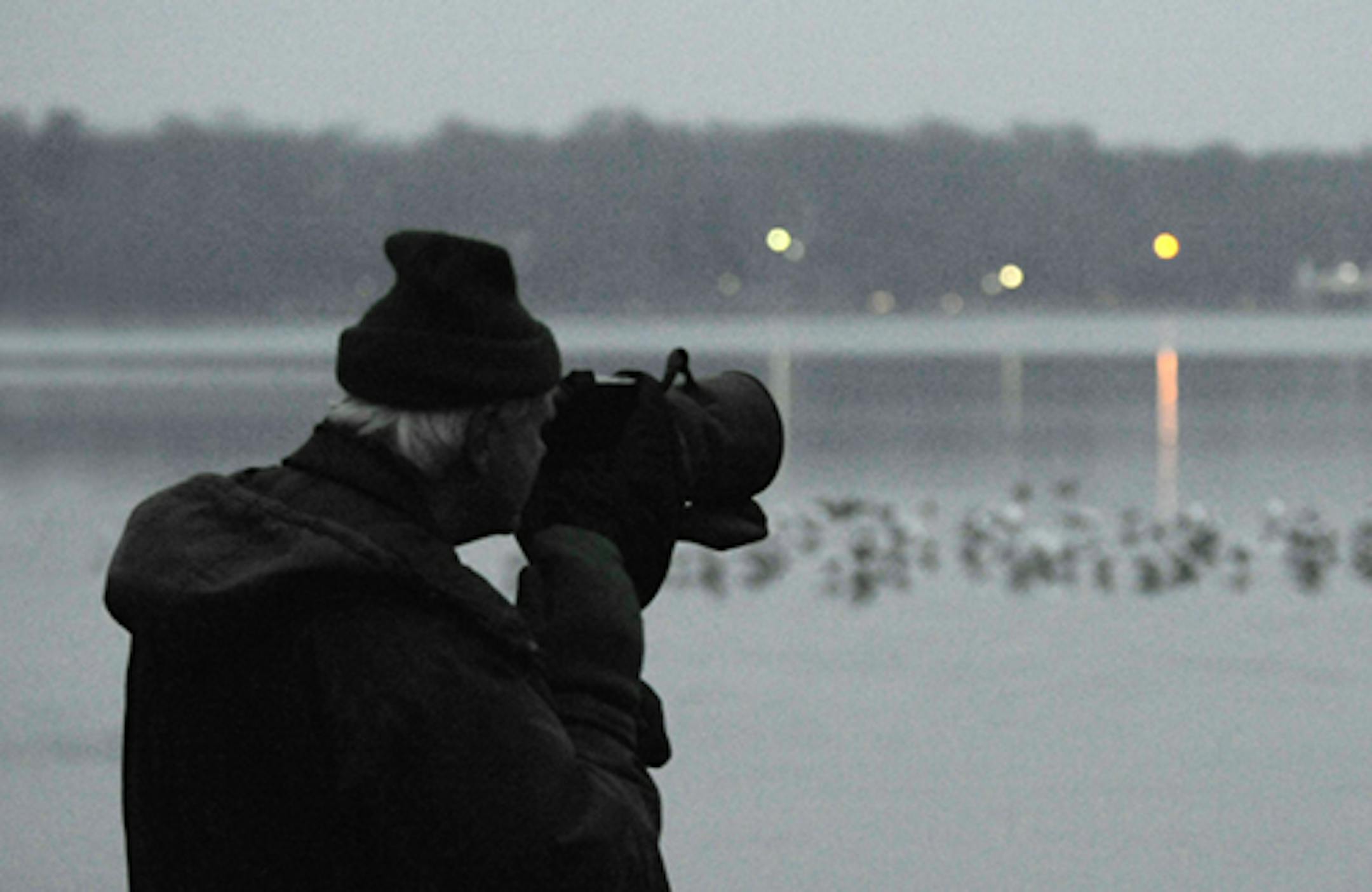 Every night now that open water remains on city lakes, gulls gather there. They fly in by twos and threes until hundreds are loafing on the ice of Lakes Calhoun and Harriet. They must be at other lakes, too – Lake Minnetonka and at Blackdog. They feed somewhere else during the day, coming to roost in the hour of sunset. At Lake Harriet, guys gather, too, birders come to look for odd gulls. The observers roost on a viewing platform on the south side of the lake, all well wrapped against the damp cold, spotting scopes their dance partners. The men – it's almost always men – visit in low tones, shuffling their feet, bending to the scope now and then, just in case. The flock on the ice in front of them is mostly Ring-billed Gulls with a few Herring Gulls, one Franklin's Gull, and maybe a Thayer's Gull or two. What they really want to see is the Lesser Black-backed Gull that has been seen here and at Calhoun for several days. It's a bird that winters on the East Coast, an unusual, a "good" bird for Minnesota. Monday afternoon it was in plain sight at 3:30 right at this spot, in decent light, too. Not Tuesday. Not when I left, anyway. Maybe in a minute or two or 10. All observers were in place when I walked away, following the growing glow of street lights back to my car.