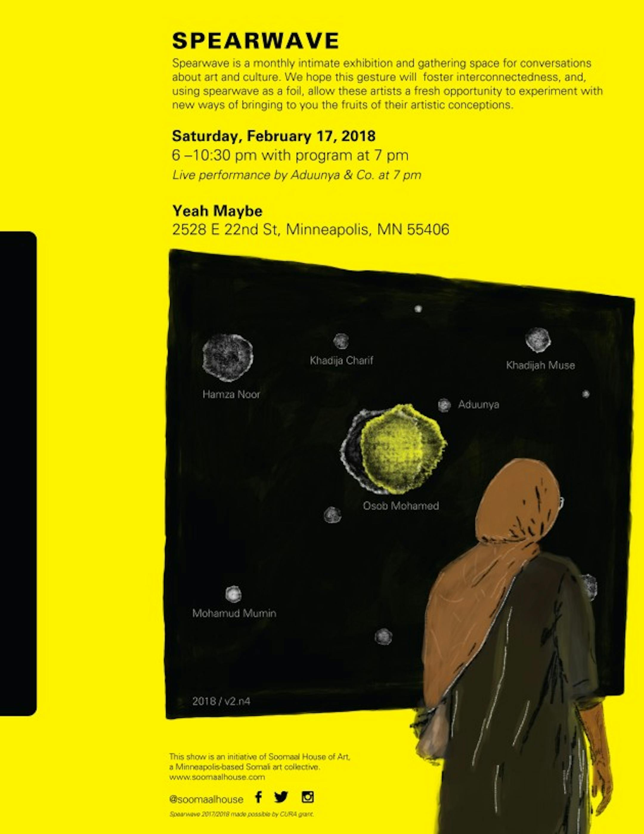 This Saturday from 6-10:30 p.m., Yeah Maybe hosts a monthly exhibition and community gathering space called Spearwave. For this month's installation, a collaboration with Soomaal House of Art, artists Aduunya, Khadija Charif, Khadija Muse, Osob Mohamed, Mohamud Mumin and Hamza Noor will present their work.