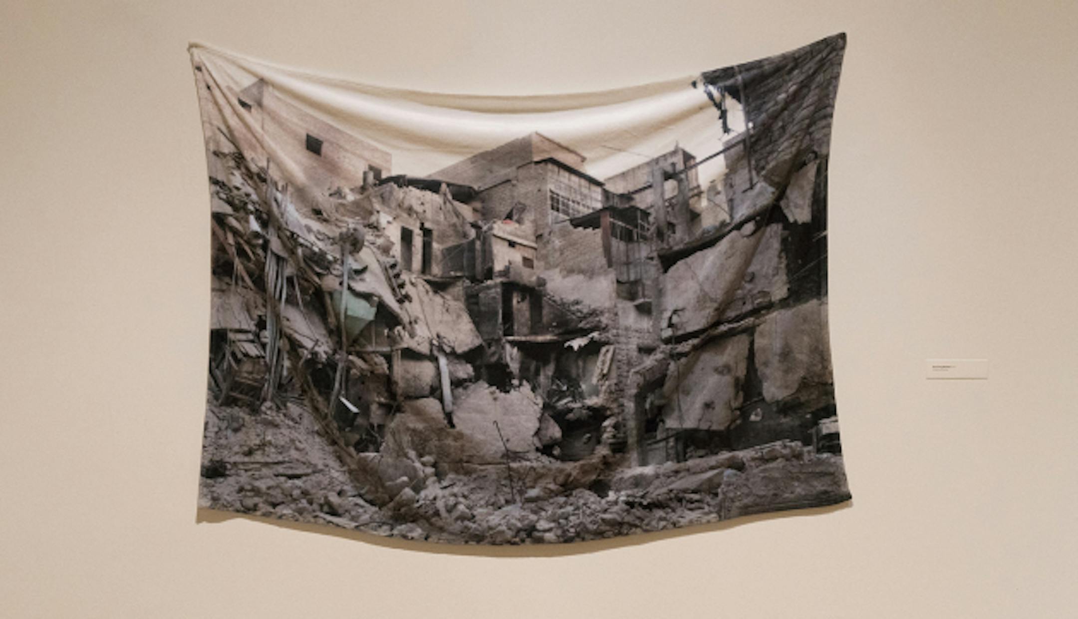 Above: "Receiving Blanket," a plush blanket imprinted with a bombed-out building, is part of Essma Imady's exhibit "Thicker Than Water."
