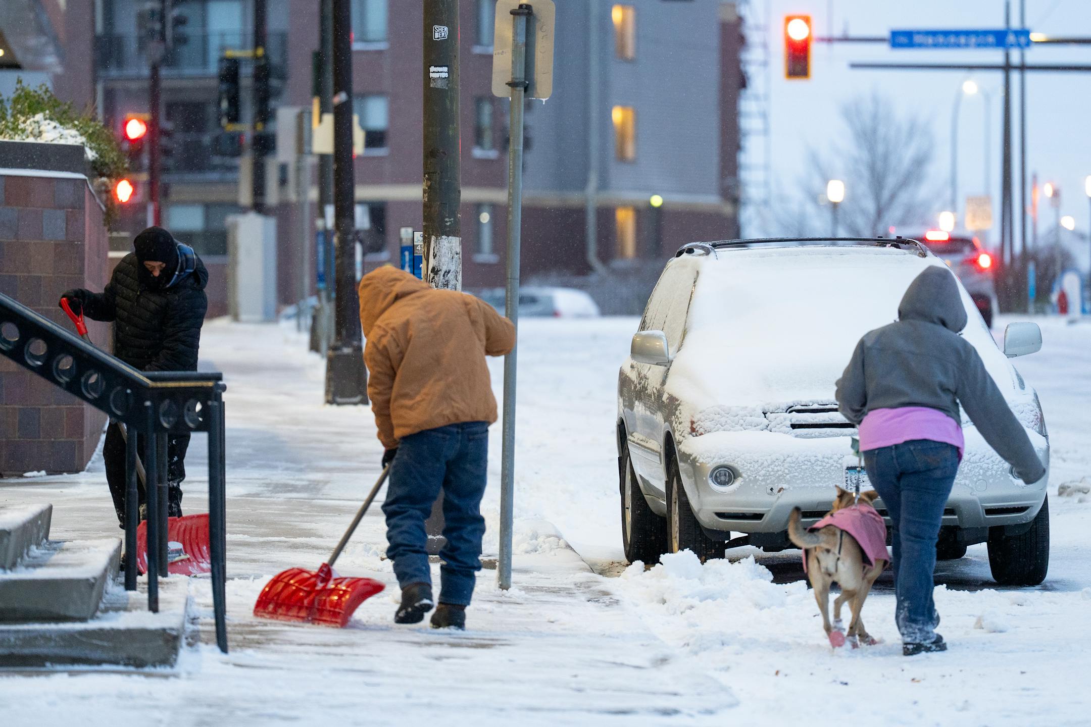 The snow falling across the southern third of Minnesota, including the Twin Cities area, is expected to last throughout Saturday, with heavier accumulations after noon.