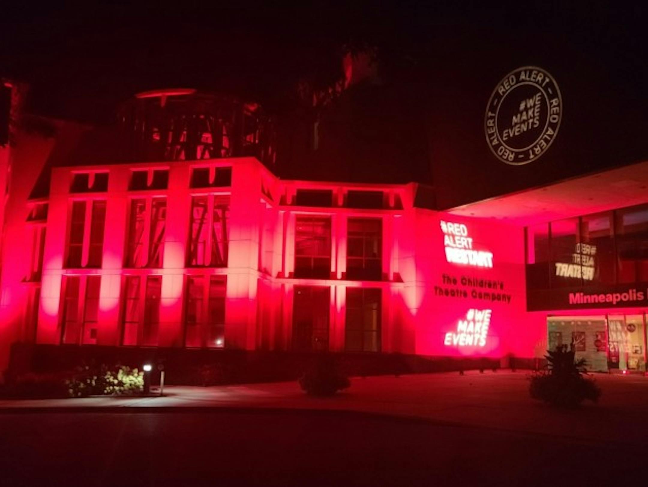 The mainstage and the normally tan façade of the Children's Theatre were bathed in deep red lights Tuesday night. Red lights also flooded the frontages and innards of Chanhassen Dinner Theatres, the Guthrie, and a host of other playhouses and performing arts venues in Minnesota and across the nation.