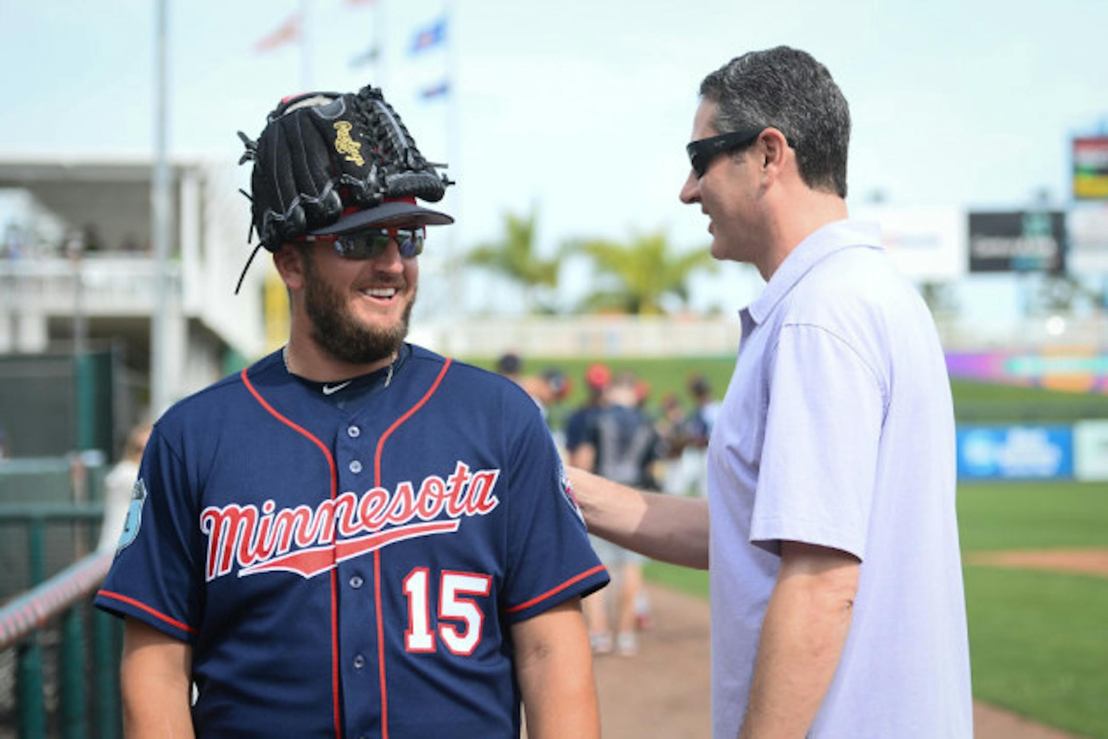 Former Twins closer Glen Perkins (pictured with Twins GM Thad Levine during 2017 spring training) will be the on-air analyst and answer questions from Facebook users. His media-pass photo is his uniformed mug shot from his playing days.