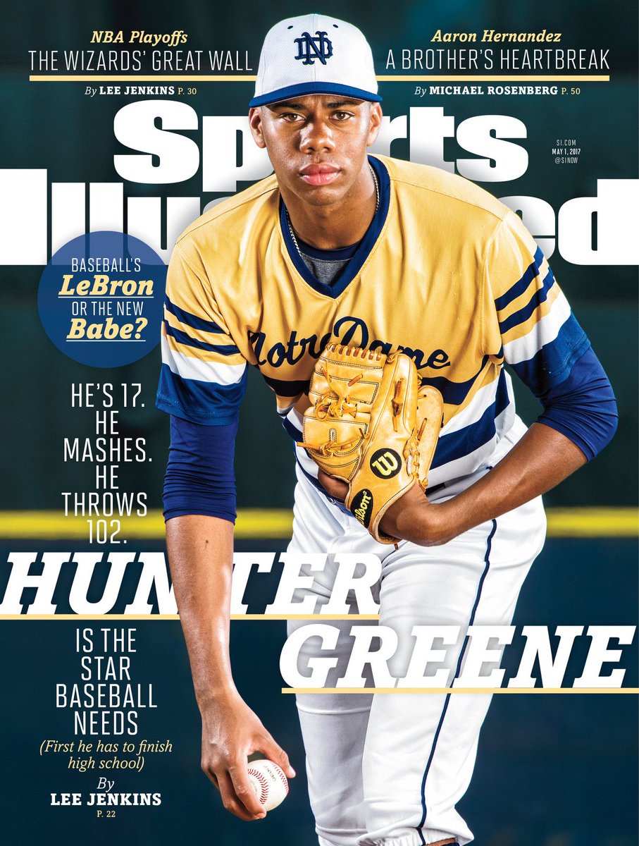 "He's 17. He mashes. He throws 102. Hunter Greene is the star baseball needs," the magazine headline continues. "First he has to finish high school."
