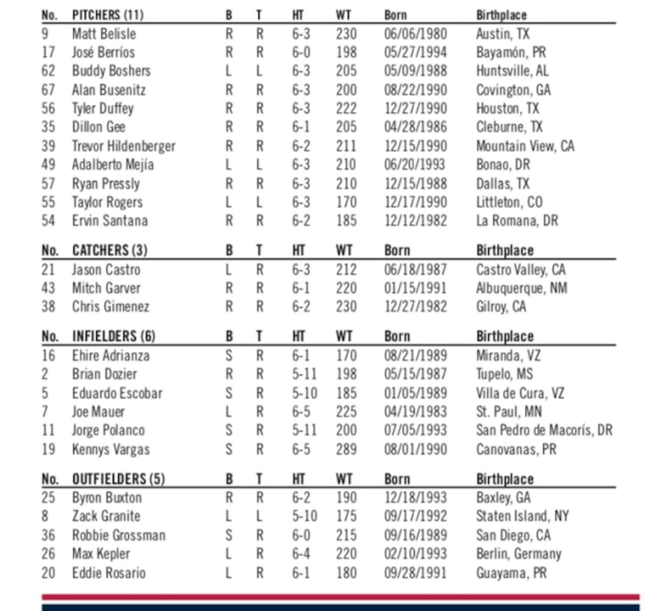 Pitchers: Matt Belisle, Jose Berrios, Buddy Boshers, Alan Busenitz, Tyler Duffey, Dillon Gee, Trevor Hildenberger, Adalberto Mejia, Ryan Pressly, Taylor Rogers, Ervin Santana