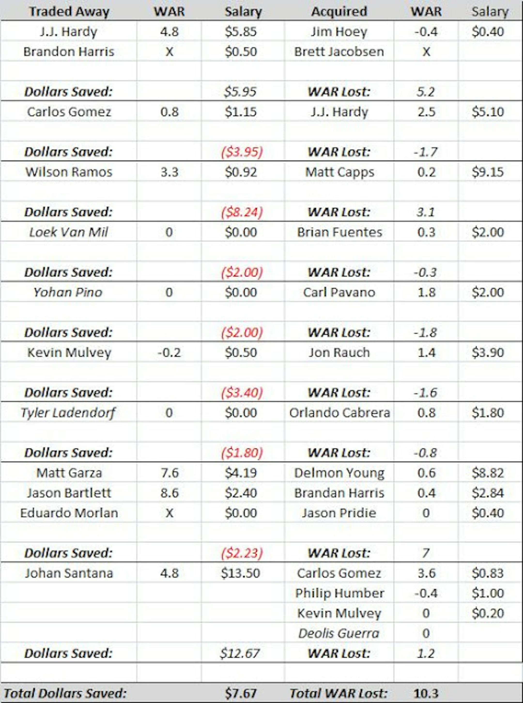 Even though the Santana-for-Gomez and the Garza-for-Young trades started his legacy off on the wrong foot, Smith and his team were able to piece together favorable trades after the more egregious ones. He grabbed Carl Pavano and Jon Rauch for a pittance. Orlando Cabrera and Brian Fuentes were also exchanged for little compensation. He landed JJ Hardy for Carlos Gomez. Those moves together provided the Twins with 6.2 wins above replacement and only "cost" the team roughly $10 million in added salary.