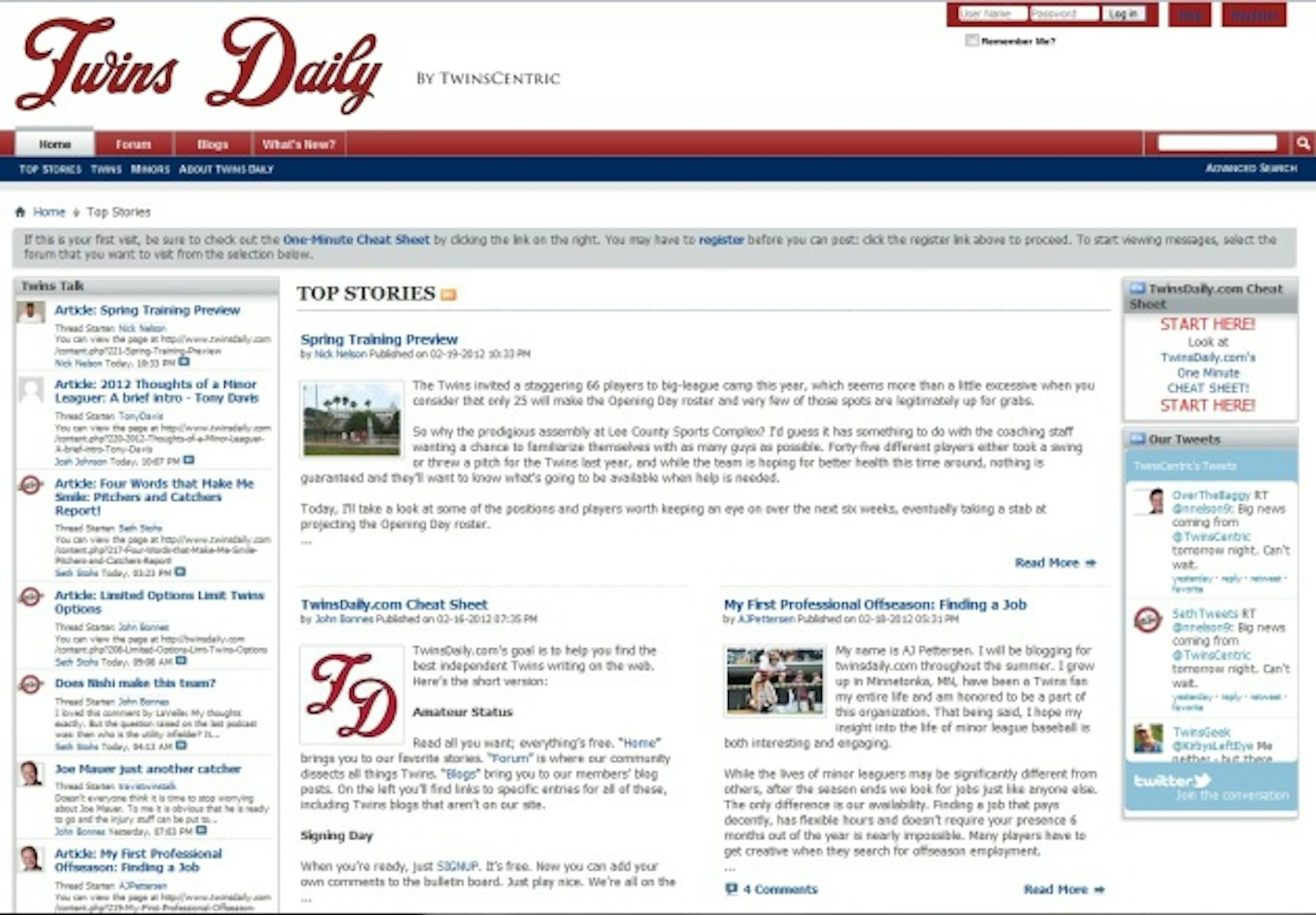 When I find out that someone has blogged, they have instant credibility. Sure, anyone can write. But to do so consistently, and make it insightful and entertaining without payment or promise of payment or even any hope that what you're doing is going anyplace beyond dissolving into the ether – I want to know these people. That is a story of faith. And passion. And dammit, nobility. Which is why it kills me that it may be harder to blog now than it was when I started. At least then it was new and fresh. Now it's so loud out there, I don't know how any new voice ever gets heard. And I'm as guilty of the deafness as anyone. I simply can't keep up with all the Twins blogs that have sprouted up only to go silent. That's why TwinsCentric is very proud to announce the launch of TwinsDaily.com. We're each setting aside our independence to start a central site where you can find (for free, mind you) all our stories. But the site isn't just for reading. There are two other very important pieces. First, in the hope of resurrecting the spirit of the old Dickie Thon Twins Board we're including a forum where you can discuss all kinds of Twins topics. All we ask is that you register so we have some accountability for the discussions, and that you keep it civil. We're all on the same team. Second, when you register, you get a blog. You can ignore it if you want, or you can try out your voice. If your post is good, we'll find room for it on the front page. And if it's bad? Well, then we won't. But at the very least you'll be trying to find your identity where thousands of Twins fans are stopping by each day. TwinsCentric has worked on several magazines, books and e-books over the last couple of years, but I think it's safe to say that we're more excited about this than any of them. This is a site we want to exist: a local place where Twins fans can gather, read, share and write. If that sounds great, then please swing by. And if it sounds too over the top, swing by anyway, because that's exactly what we want it to be. Thanks,TwinsCentric P.S. If you're looking for a good place to start, stop by the front page or check out our one-minute cheat sheet.