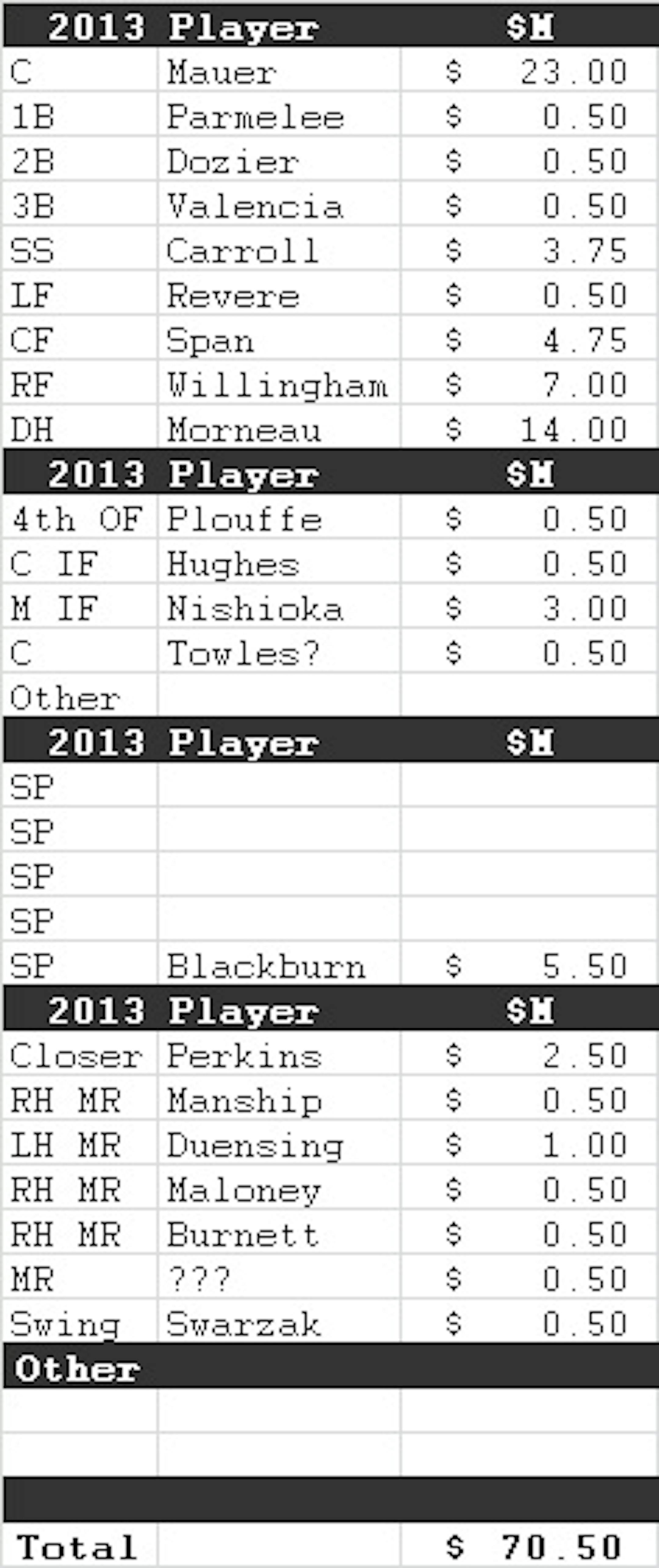 The question is: could they afford to overpay for Baker? To figure that out, one needs to take a look at what the roster might look like in 2013 and do a little back-of-the-napkin calculating, which you'll find on the right. Can the Twins afford to pick up Baker's option? The short answer is: yes, probably.