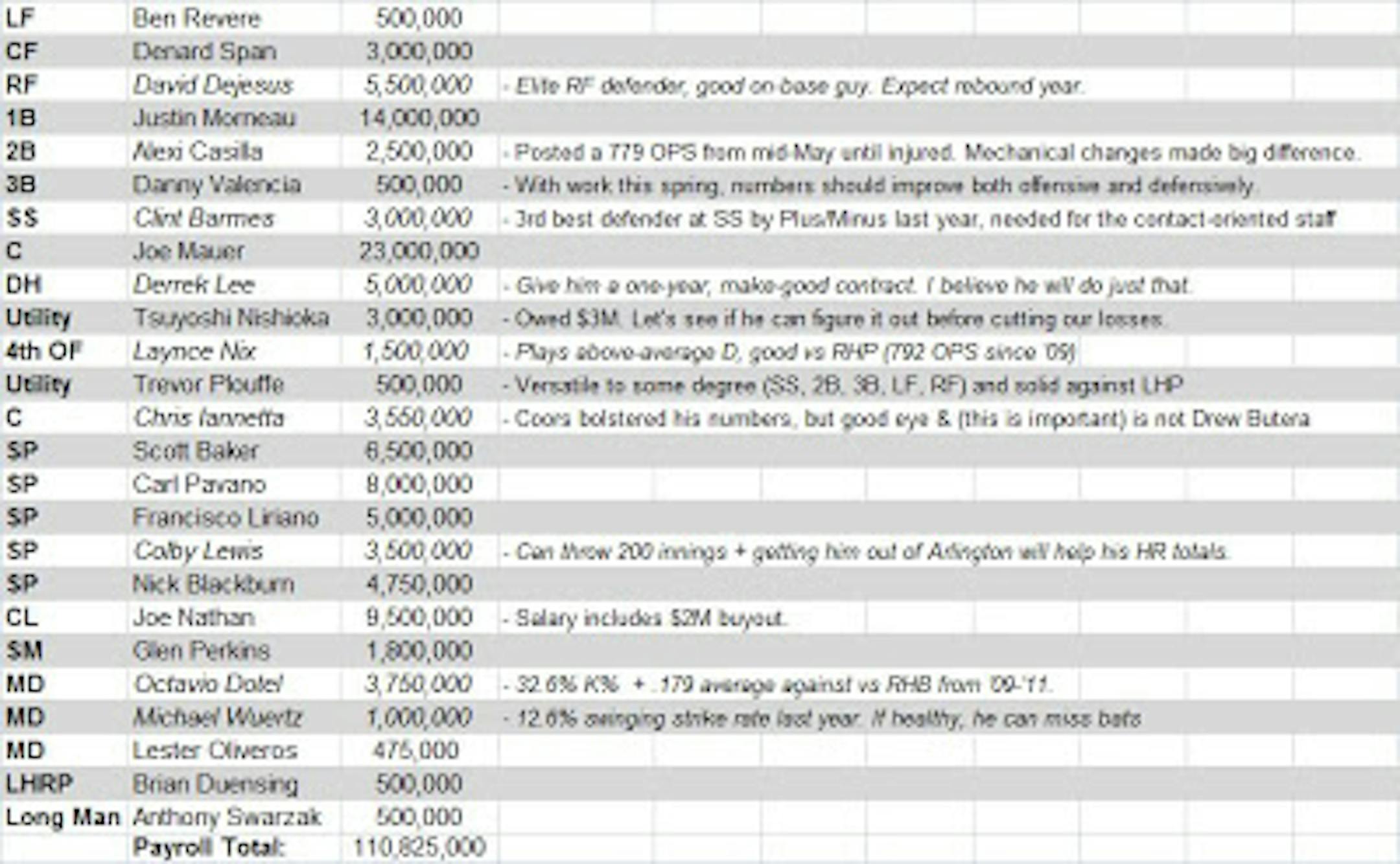 (Click to embiggen) This roster addresses some of the team's more critical needs including middle infield defense, adding professional hitters, bench depth, strengthening the rotation and putting a power arm in the bullpen. With the exception of Lewis and Iannetta, all moves were made without dipping into the farm system. Likewise, payroll was pared down to near $110 million.