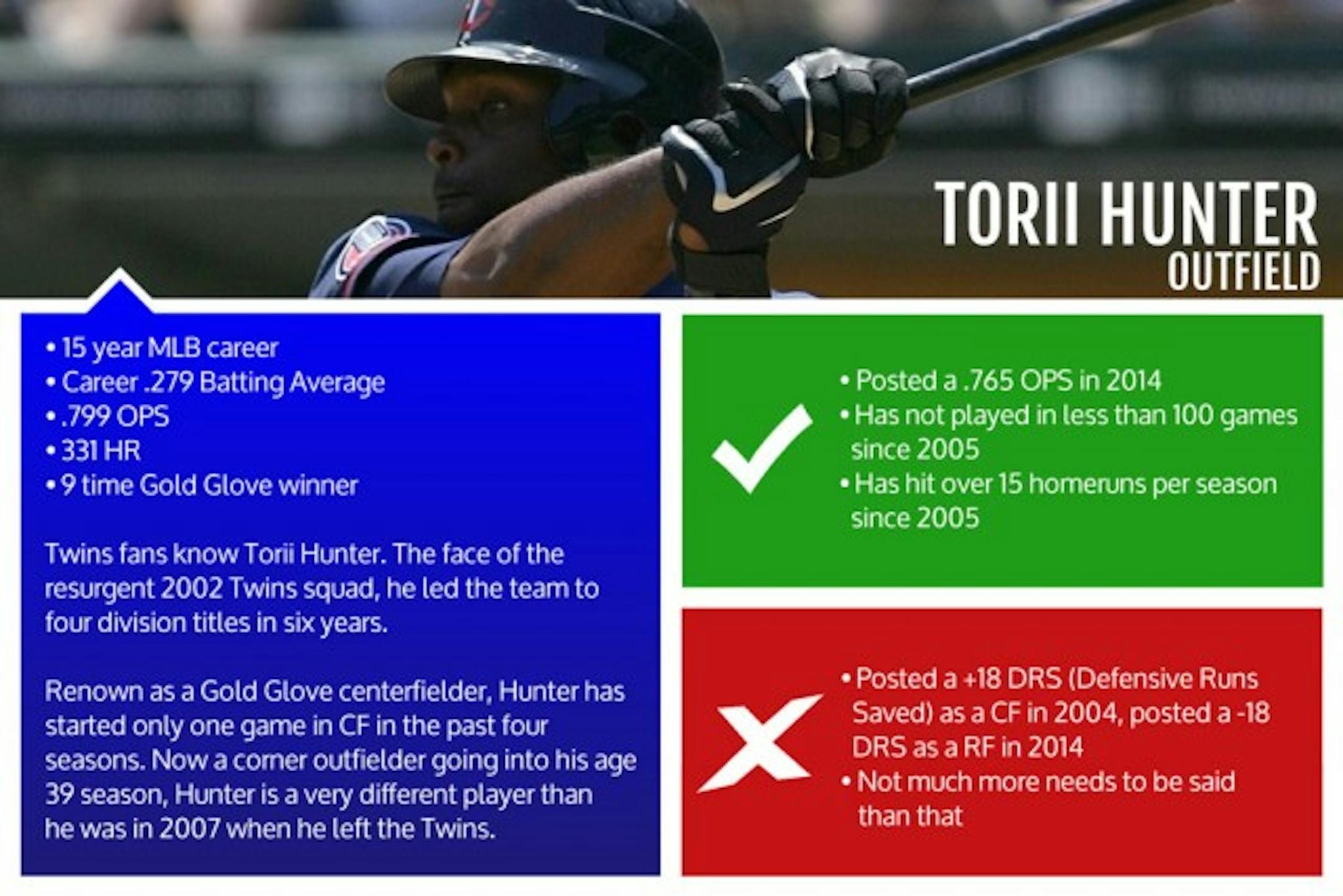 On Tuesday, the Twins made their first big splash of this offseason, signing Torii Hunter to a one-year, $10.5 million deal. And while it's certainly a better move than any of those mentioned above, once again the team seems to be eschewing logic in favor of comfort, familiarity and vague intangibles.Hunter was a fixture -- THE fixture, really -- in Minnesota's run of AL Central dominance from 2002 through 2006, when they won four division titles in five years. He has continued to produce at a consistently excellent level since leaving in '07. There's no denying that he's had a fantastic career and has taken pristine care of his body.