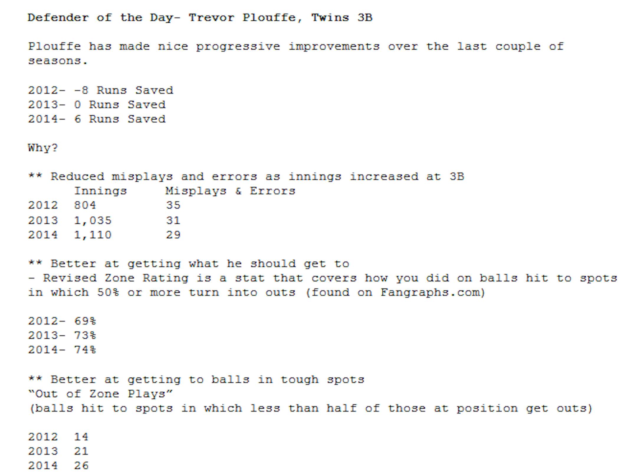 The Twins have been lacking severely as of late in the department of defense but Plouffe defensive capabilities were markedly improved in 2014 and the data backs that up. Mark Simon at ESPN Stats & Info passed along the critical defensive data that highlights what areas the third baseman has improved:
