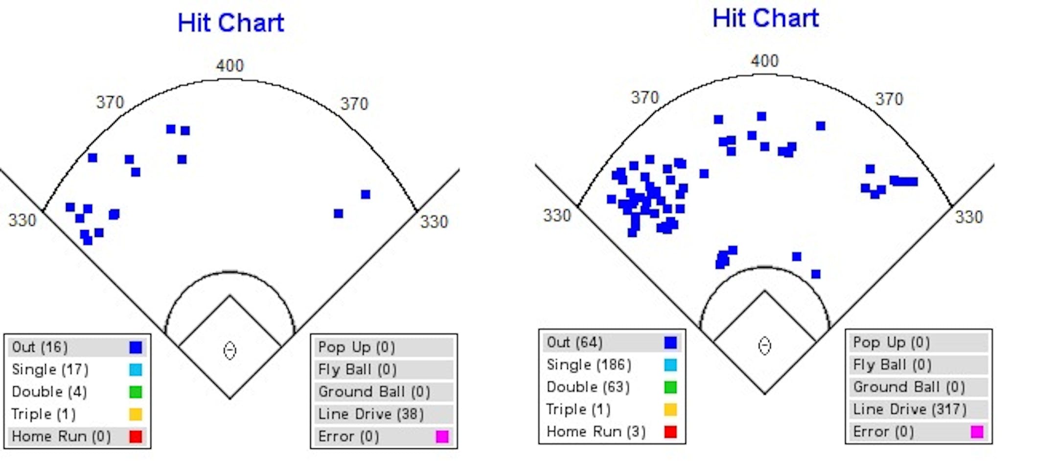 Notice how the outs on the left (2014) are closer to the left field line? Those hard hit balls would be difficult to catch if a left fielder was playing in a straight-up formation.