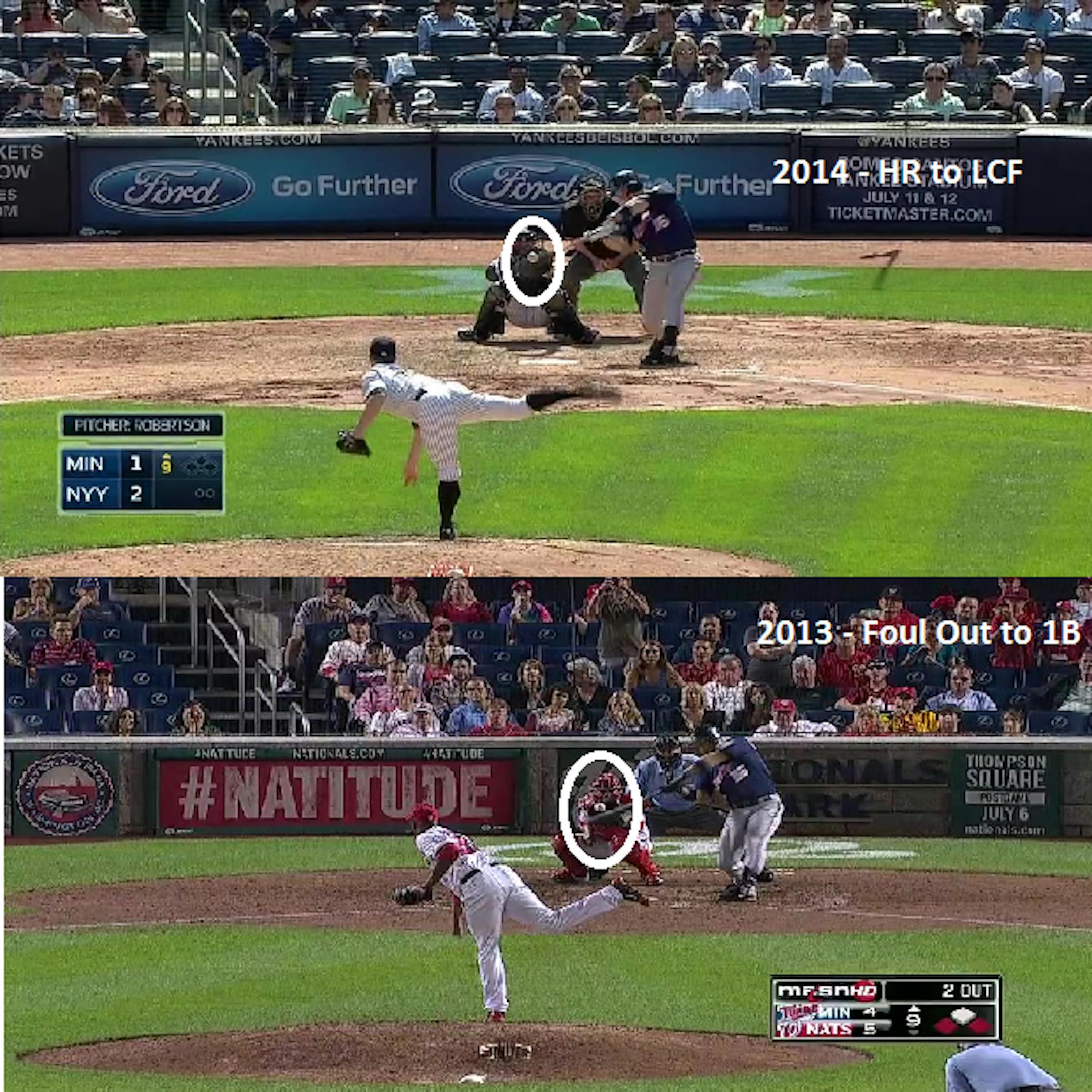 Beyond just the heat maps that may confuse the color-blind, here are two visual examples with a fastball on the outer-half where one turned into a left-center field home run and the other a foul out to first base: