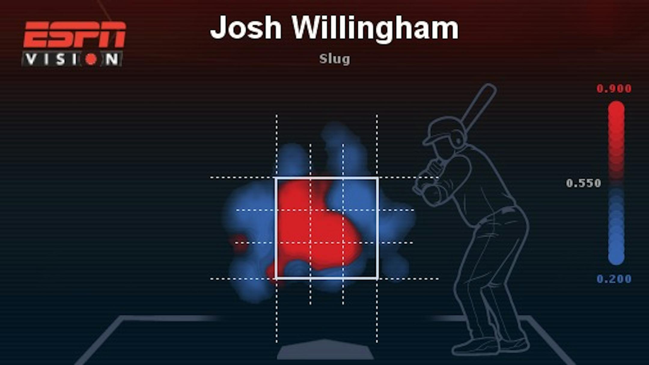 Willingham is not only able to connect with those pitches that are thrown away but he's able to drive them a long way from home. This is important because this is the region that opponents have attacked him most frequently rather than risk throwing inside: