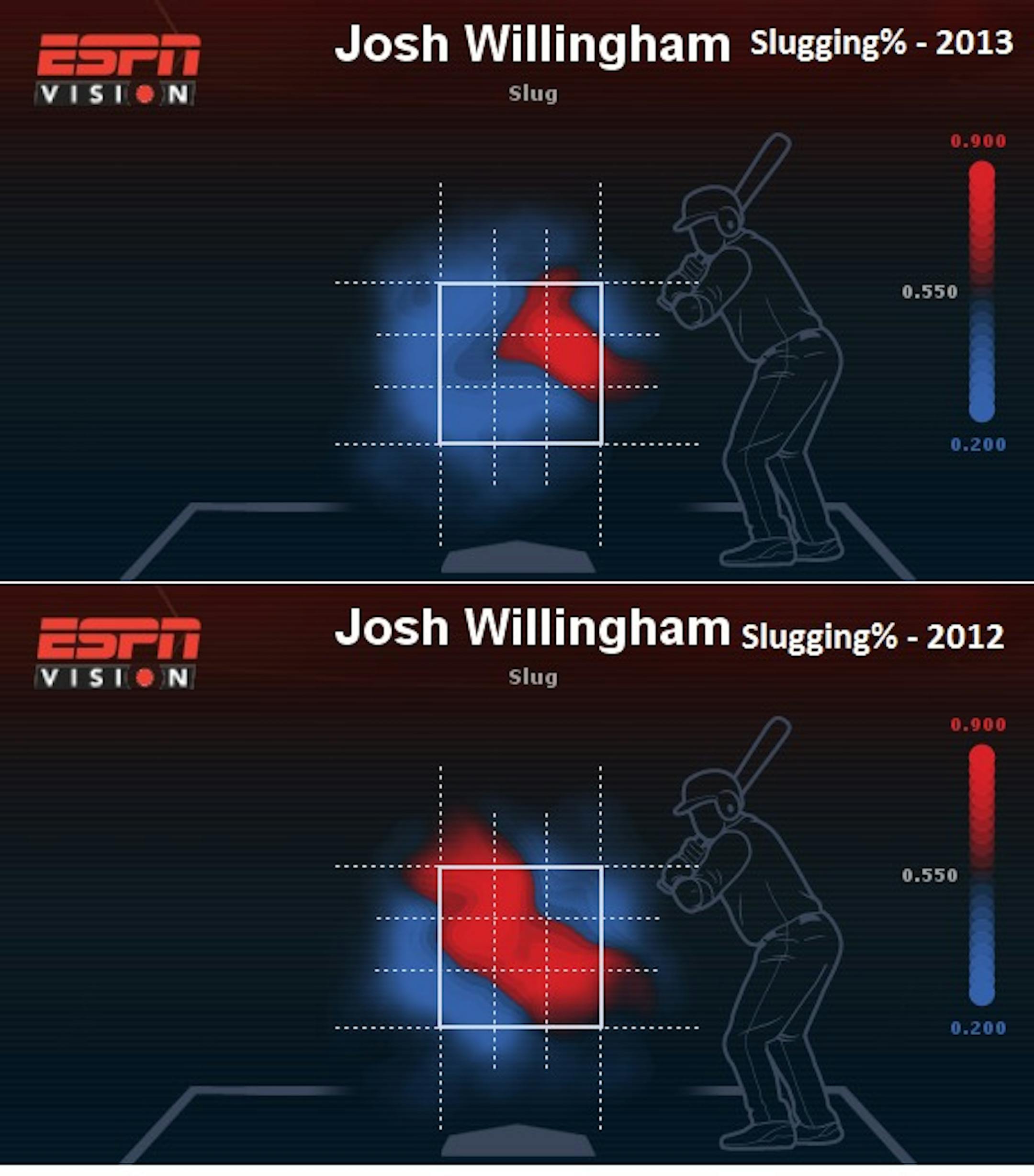 Fast forward to this season and Willingham's tendencies are mirroring his 2012 season in which he has been able to drive the ball on the outer-half with authority. Statistically in 2014, he is slugging .649 because he has tagged three of his five home runs from the outside portion of the zone. Here is how that looks visually with his slugging percentage this year: