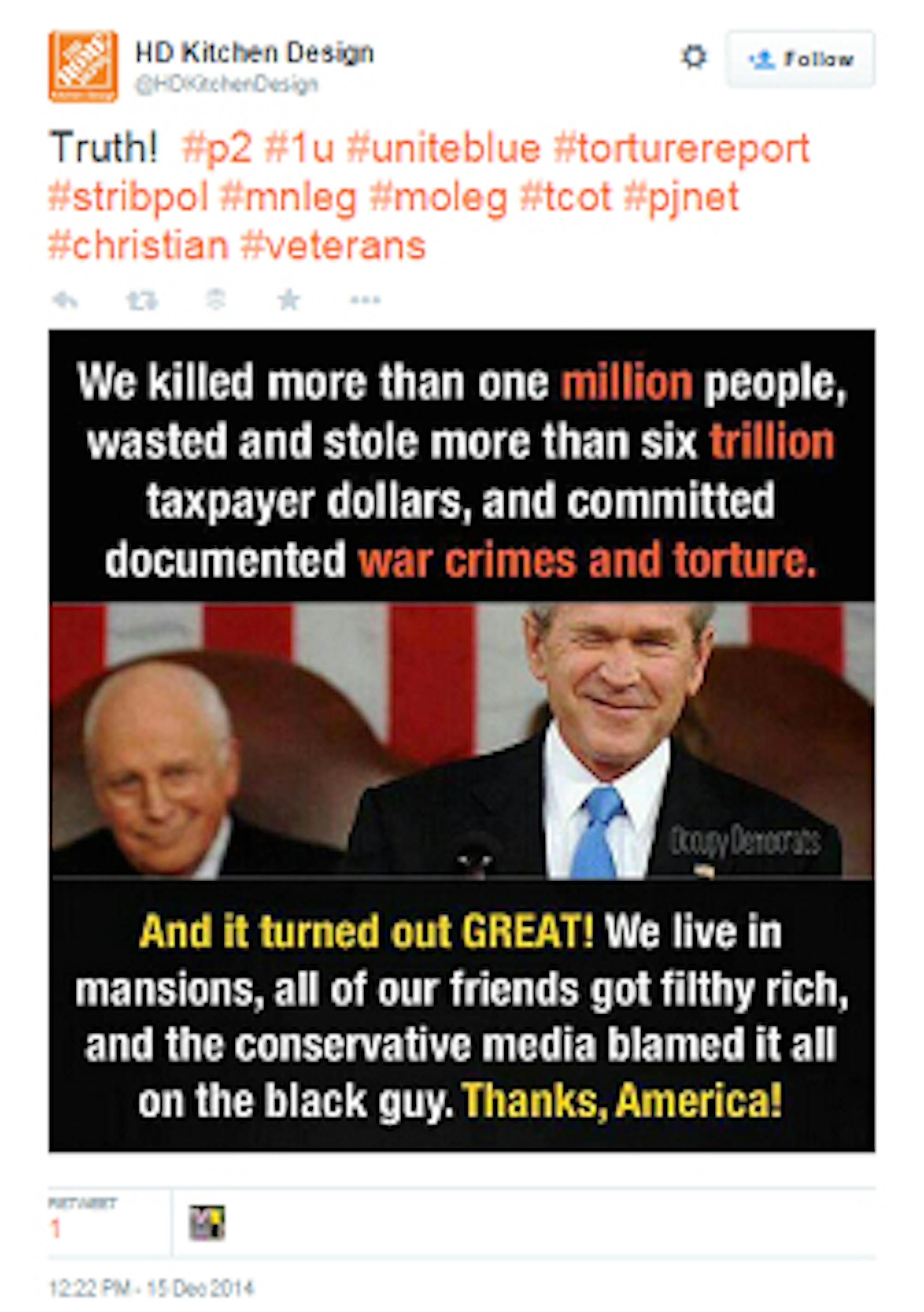Tweets highly critical of former President George W. Bush and Vice President Dick Cheney were sent today by a Twitter account used by the Home Depot Kitchen Design located at a Home Depot store in Apple Valley. Less than two hours after being sent, the tweets were deleted and the Twitter account was taken down.