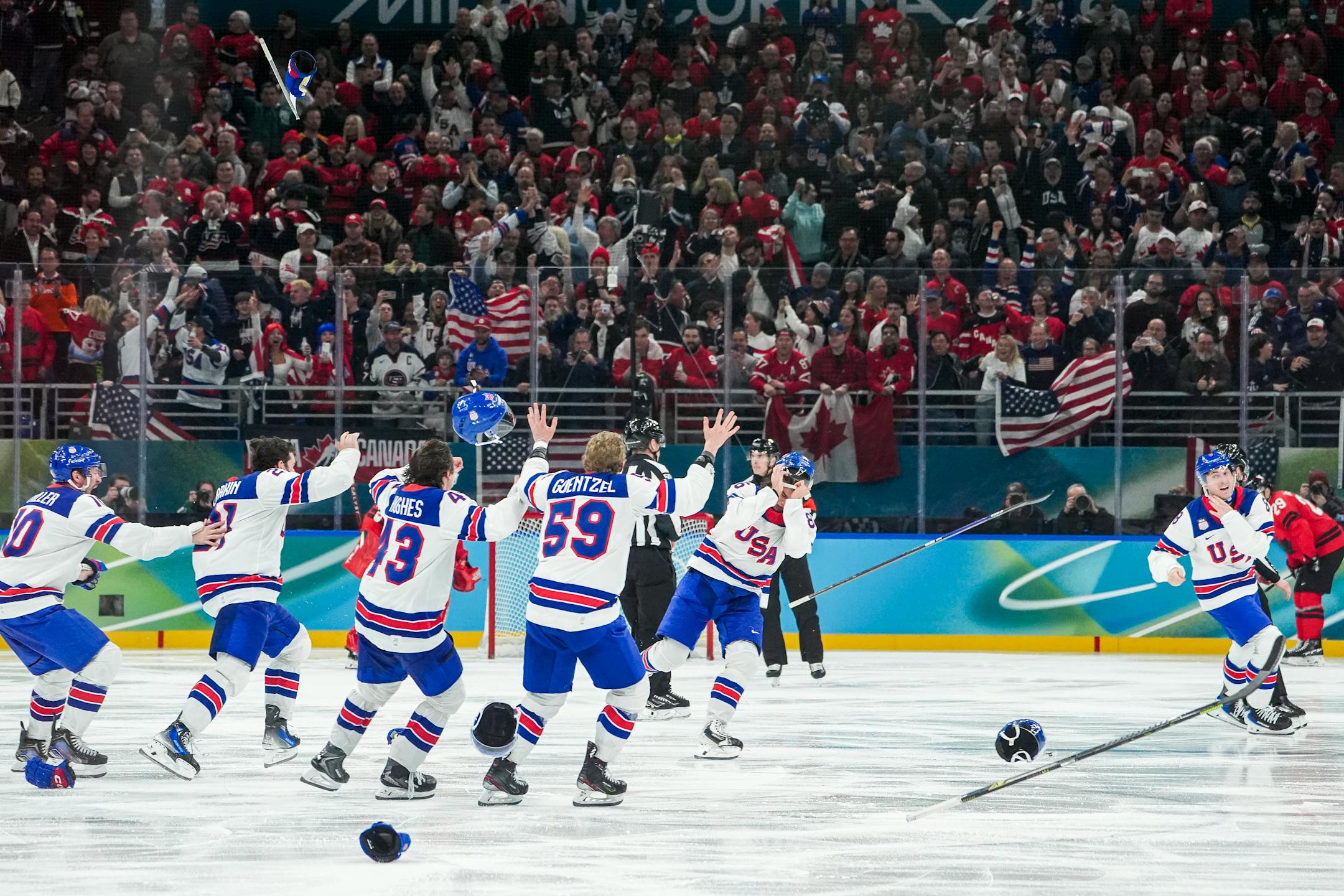 In a call to the boisterous men’s locker room Sunday, Trump praised the athletes for their dramatic 2-1 overtime victory over Canada.