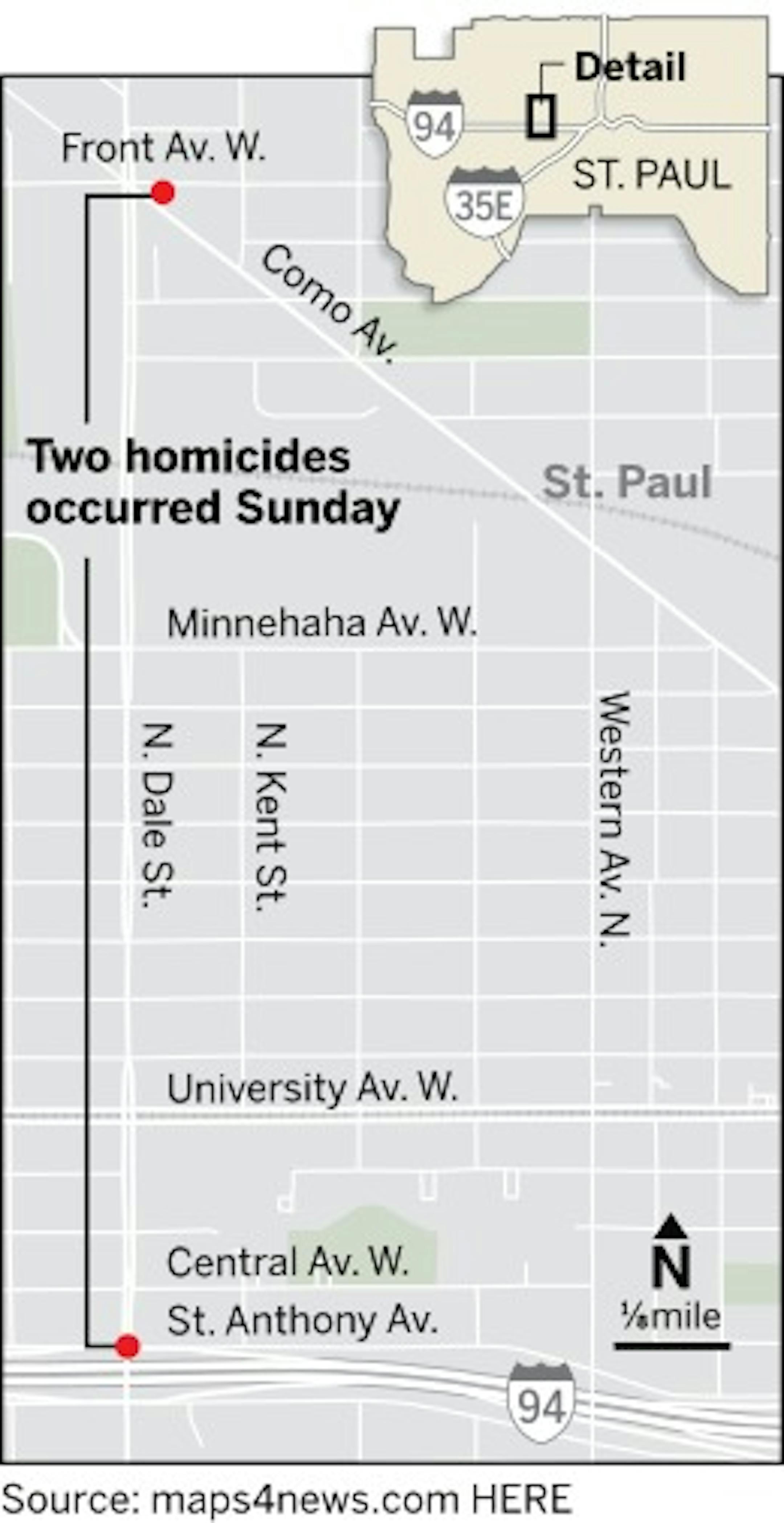 In an unrelated killing that occurred just before 11:30 p.m. Sunday, police were called to the area of Kent Street and Central Avenue on a report of shots fired. They came upon a car nearby at St. Anthony Avenue and N. Dale Street, just off Interstate 94, where an unconscious man was in the driver's seat with a gunshot wound. He was taken to Regions Hospital, where he died. His name has not been released. No one has been arrested.