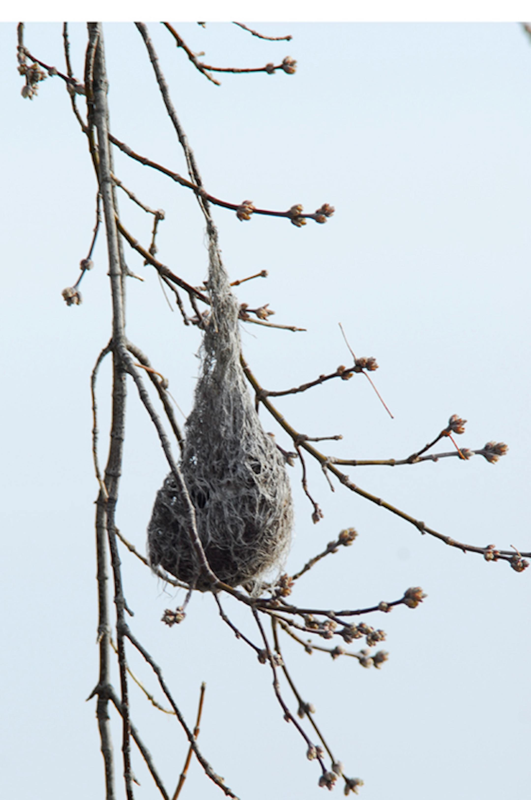 He notes that the weaver birds building nests similar to those of our orioles. The weaver birds use spiral binding, half-hitches, simple overhand knots, and slipknots to anchor the strands used to weave a nest. Oriole nests hang from small, extended tree branches. The nest is securely attached to the branch or branches at several points, lengths of plant fiber wrapped around the branch holding the nest sack securely in place. It is built to expand as the birds hatch and grow. I've watched orioles build nests, but only finishing stages. What I want to see is the bird work on the initial and perhaps biggest challenge: attaching the first strand of grass to the branch. It is most likely wrapped around and around, the bird manipulating the fiber with bill and feet.