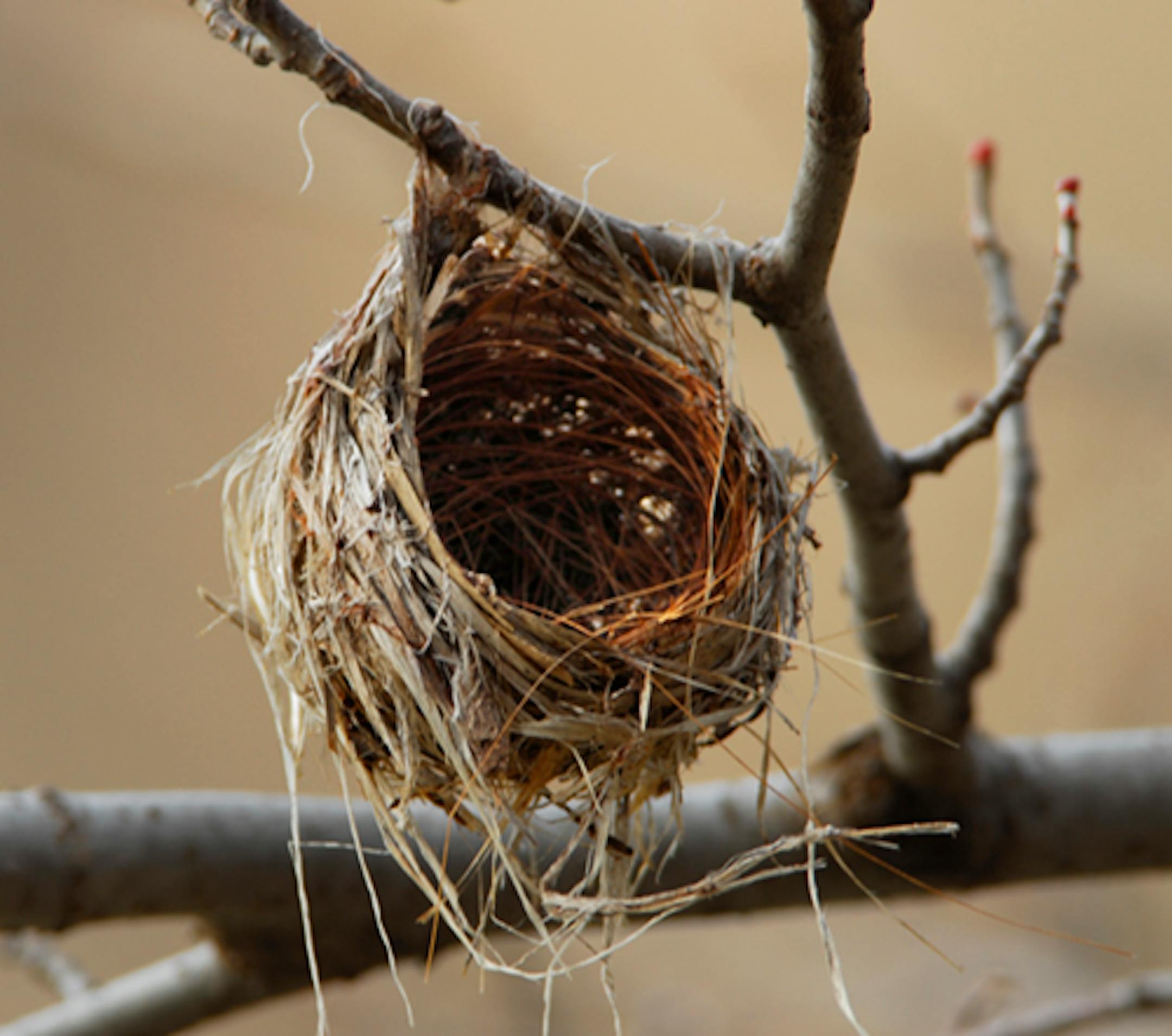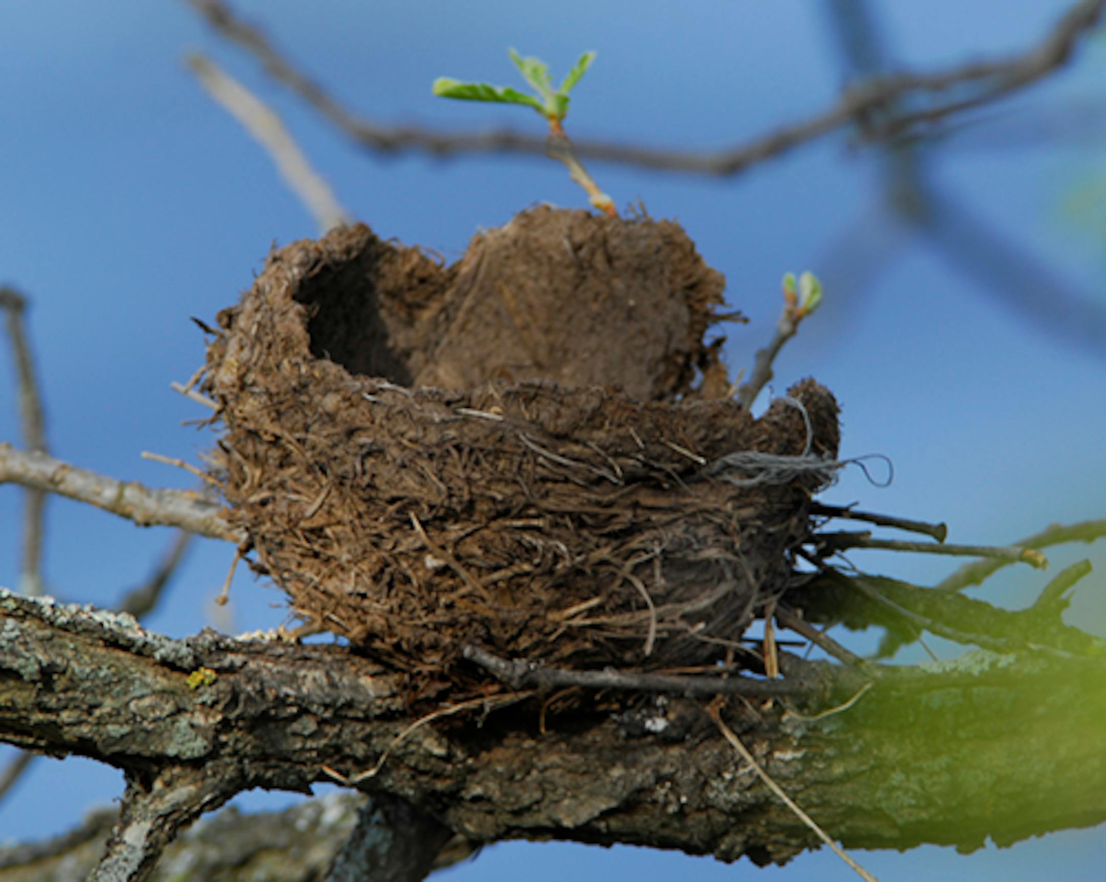 Here are photos of three previously owned nests. The first is the mud and grass cup built by American Robins. Look closely at the top right nest edge. See the piece of wire the bird used as nesting material. The second nest was built by Baltimore Orioles. The third nest, builder unknown, shows another example of grass strands used to anchor the nest to tree branches. The strands hanging from the near side of the nest have broken loose.