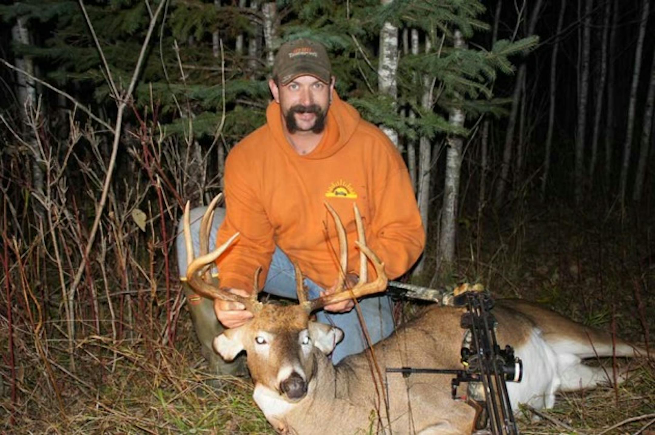My dad's cousin David Hustvedt shot this buck on October 22, 2011 with his compound bow near Blackduck, MN. The buck was an eleven-pointer with a 18.5 inch spread weighing in at 180 pounds fully field dressed. Hustvedt took the shot at a heart-racing distance of 10 yards and it's the largest buck he's shot with his bow. It's one he had been watching for a long time on his trail camera.