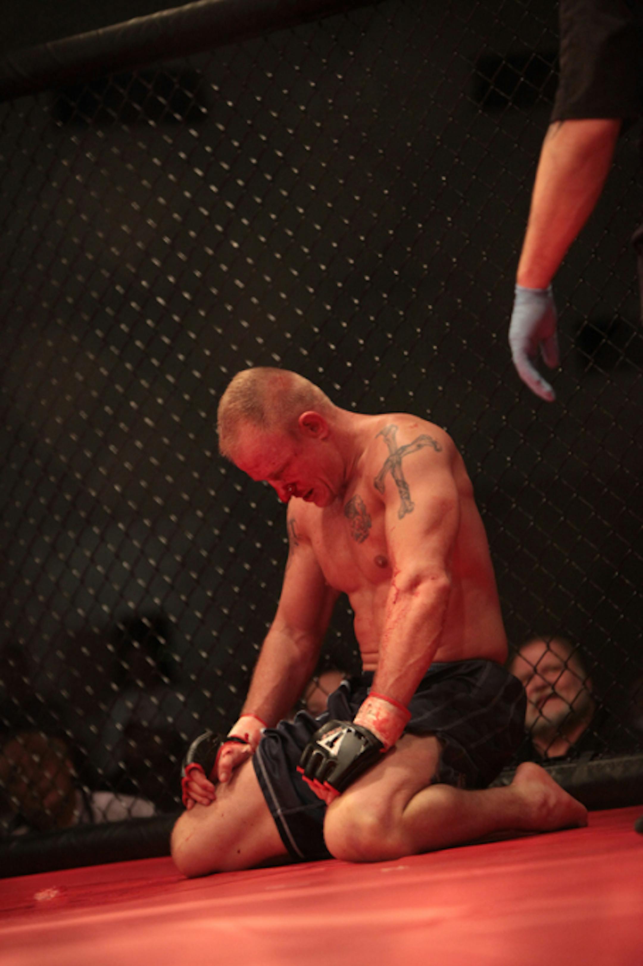 Colby Vogt recovers in the cage moments after losing to Garret Olson. Photo courtesy: ©2010 Brian C. Olsen