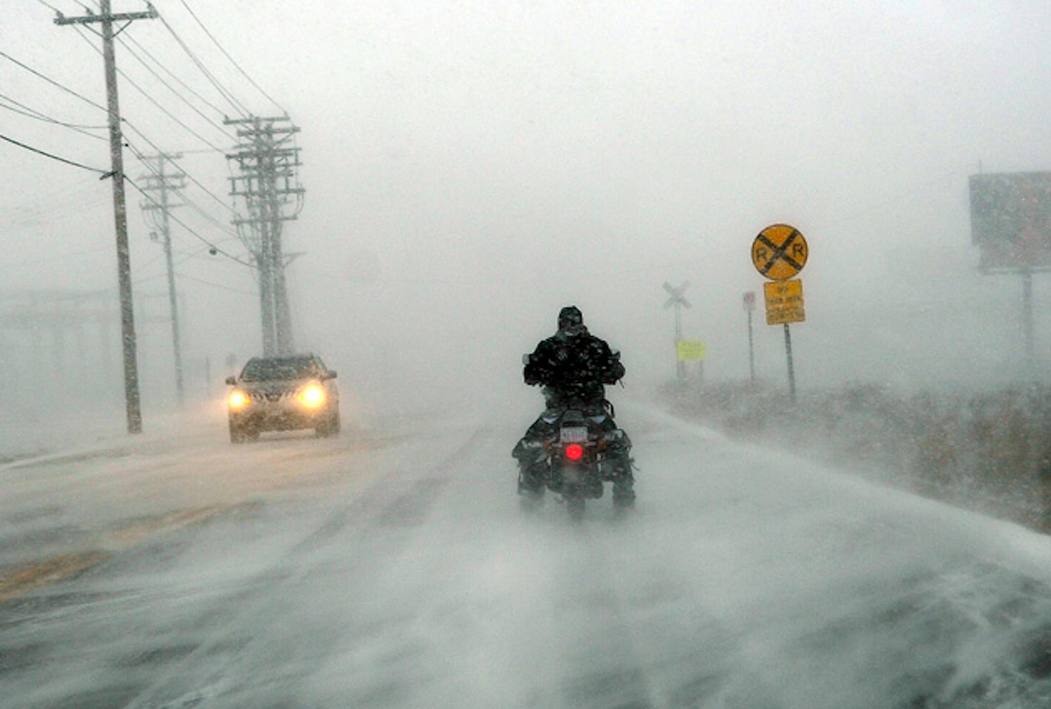 A motorcyclist relied mostly on his feet to balance his Harley along an icy Railroad Street at the start of a spring snow event Thursday morning in Duluth. The snow was wet and heavy, and the easterly winds off Lake Superior helped to create a whiteout that led Duluth people to call for no non-emergency travel in the community. Howie / For StarTribune.com