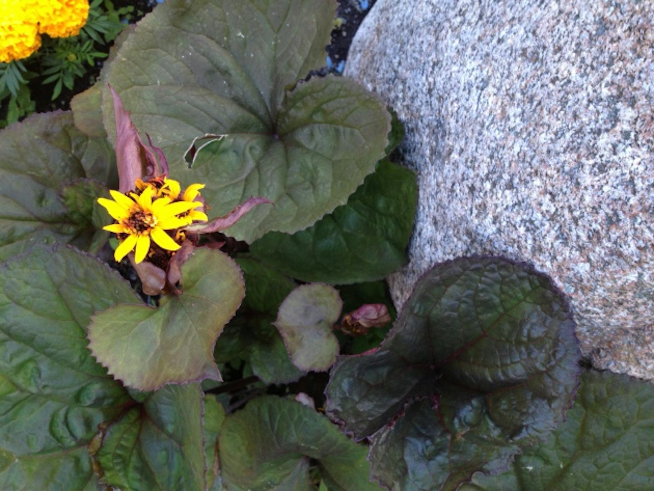 The dark-leafed ligularia remained flower-free, which was fine. Then last week, an unfamiliar lump appeared atop one stem. When I looked closer, I could see that it was the beginning of some kind of flower. Yesterday the new flowers revealed themselves. They're also yellow, but a richer, more golden hue, and the form is a little stubbier and more compact, with shorter petals.