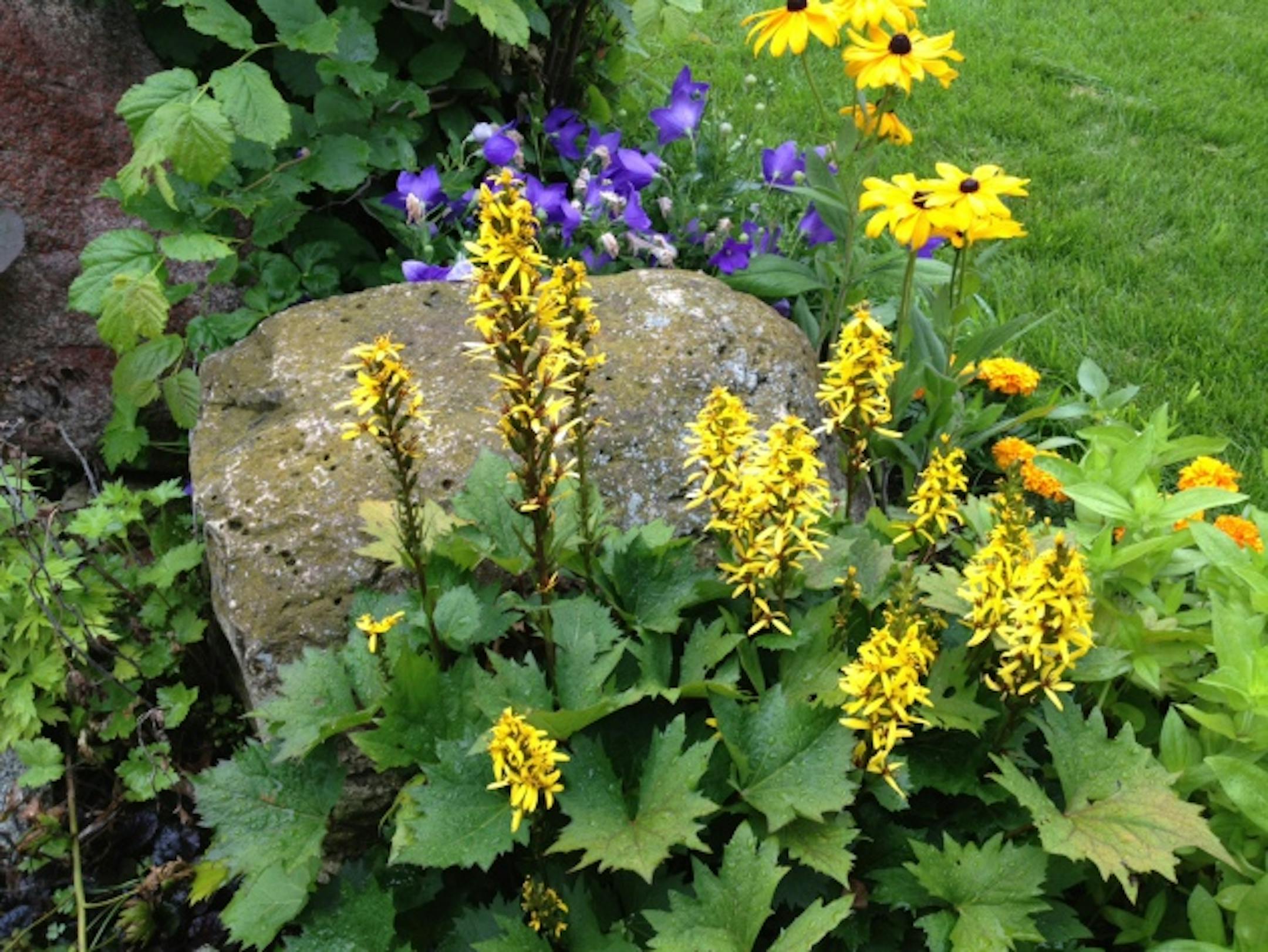 This season's surprise in the garden was a ligularia's decision to bloom, after years of displaying only foliage. I have two kinds of ligularia, one with green leaves with serrated edges, and another with darker, glossier leaves with a smoother edge. I didn't expect flowers out of either variety when I first planted them about eight years ago. I didn't even know ligularia had flowers. I just liked their big foliage.