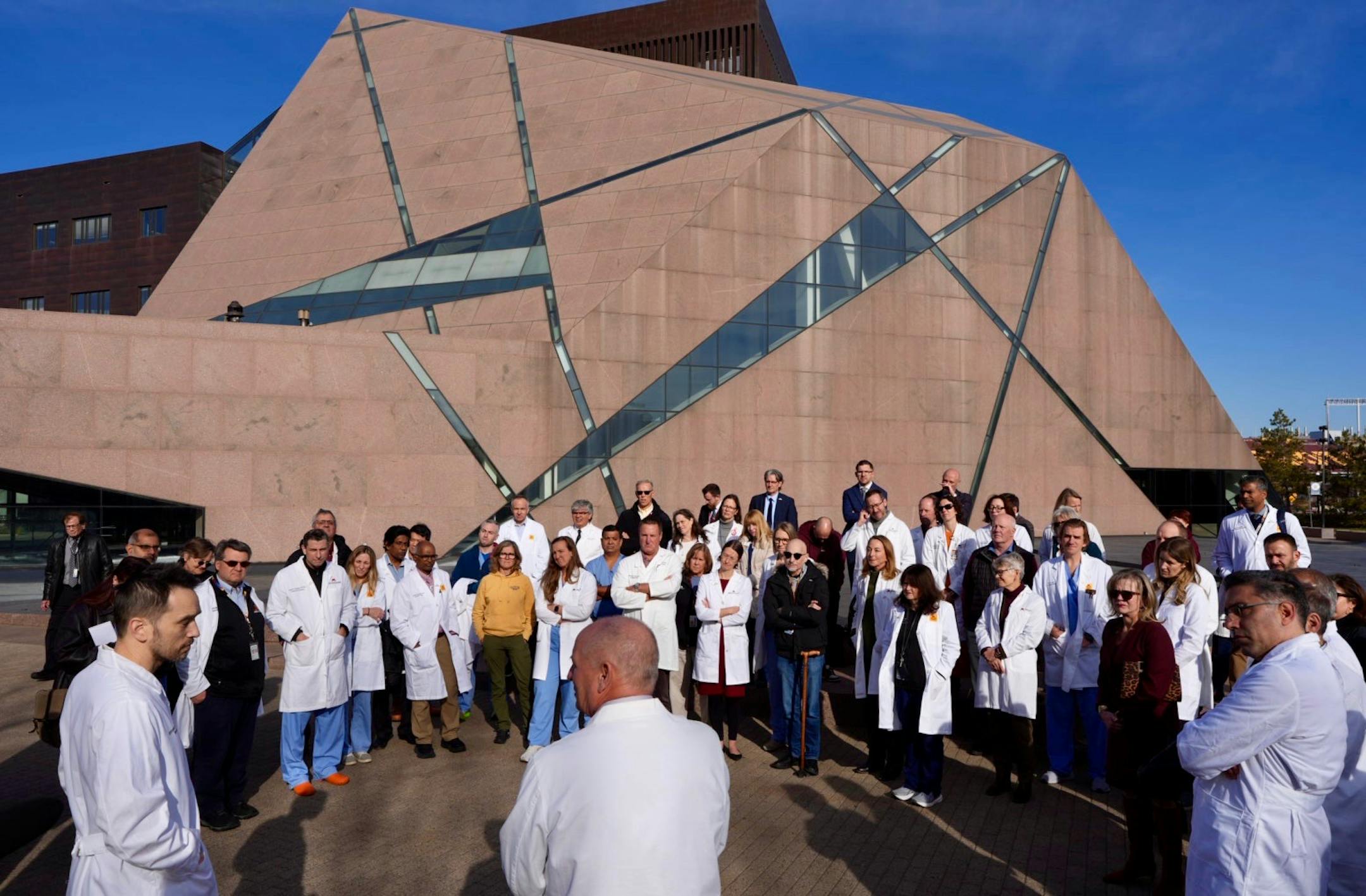 The announcements came as nearly 70 members of the physicians group, most wearing their white coats, gathered informally Friday afternoon outside McNamara Alumni Center, where the Board of Regents meeting was supposed to be held.