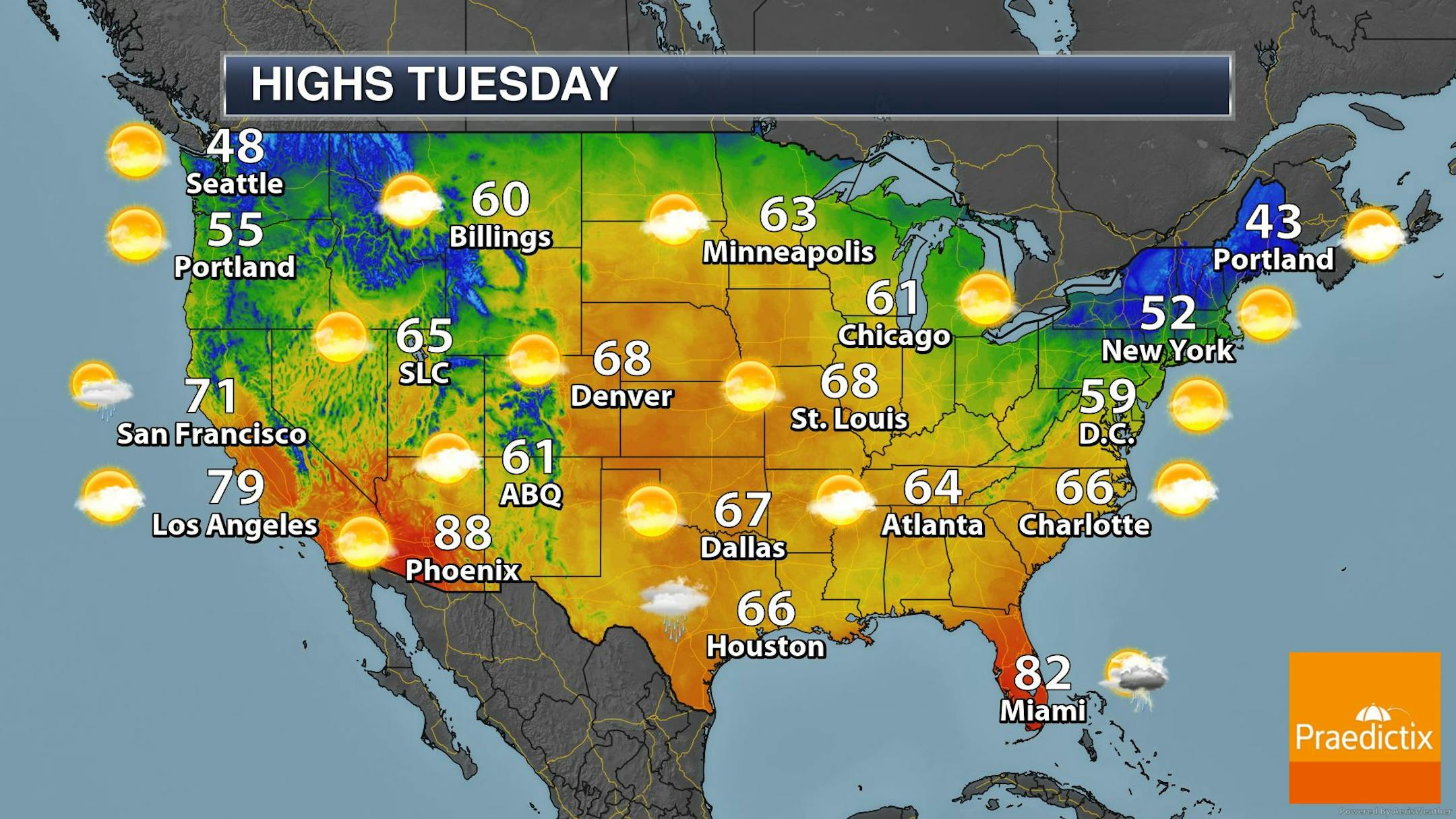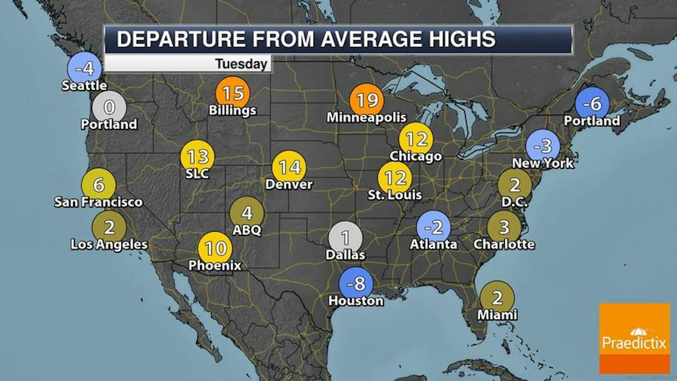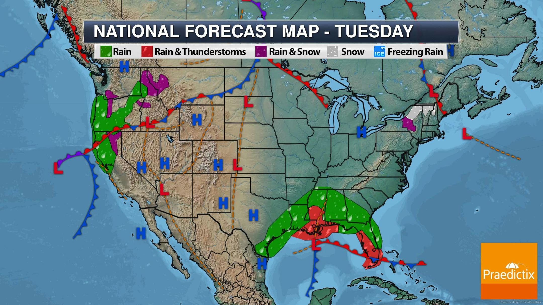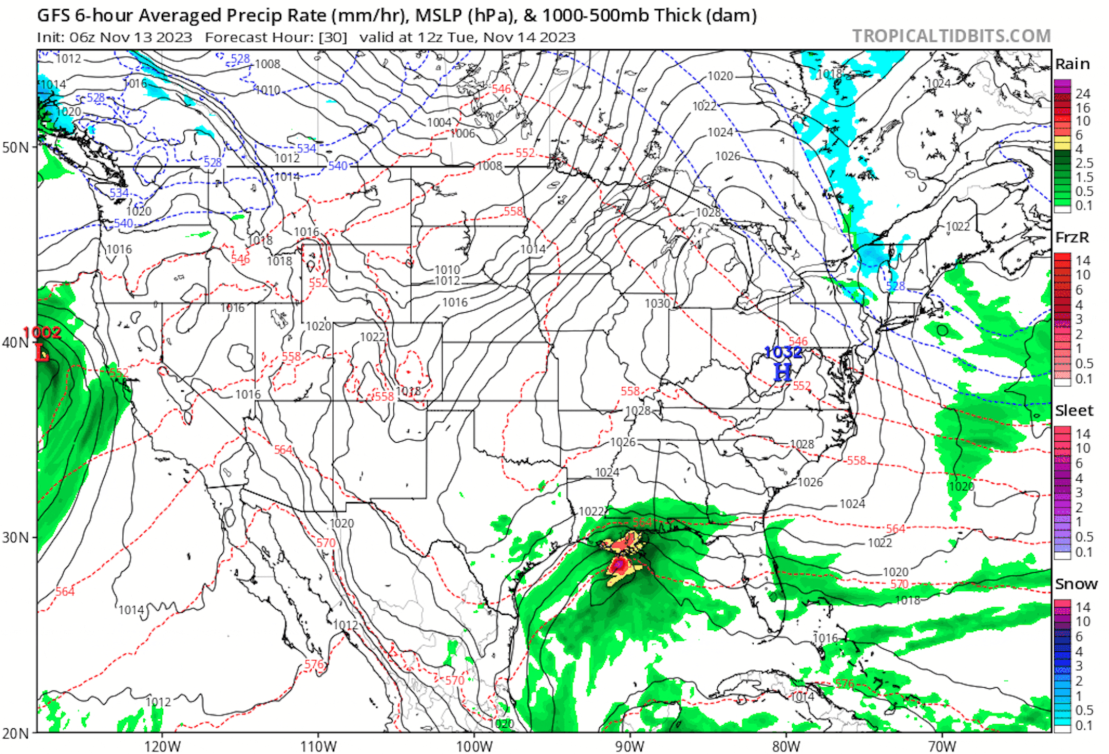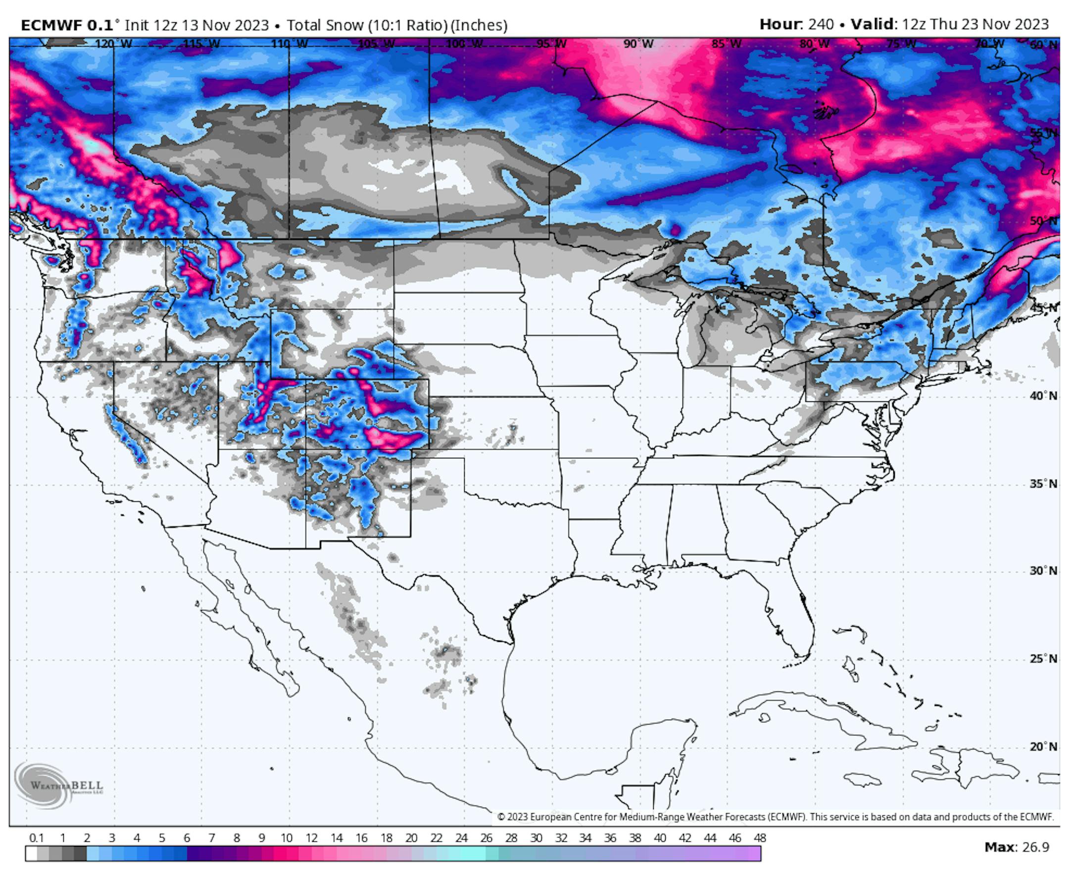 According to the ECMWF weather model, areas of snow will be found across the high elevations in the Western US. There will also be some decent snowfall along the international border and just north into Canada.