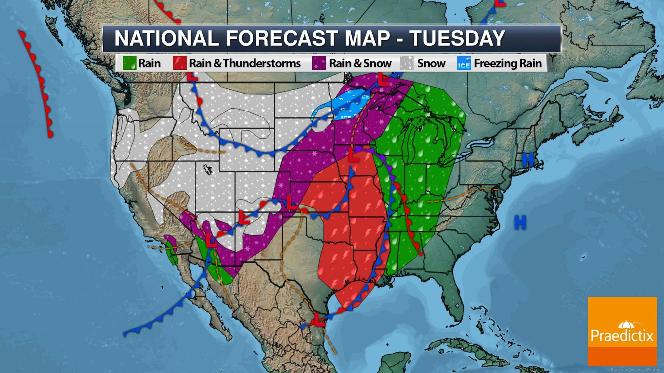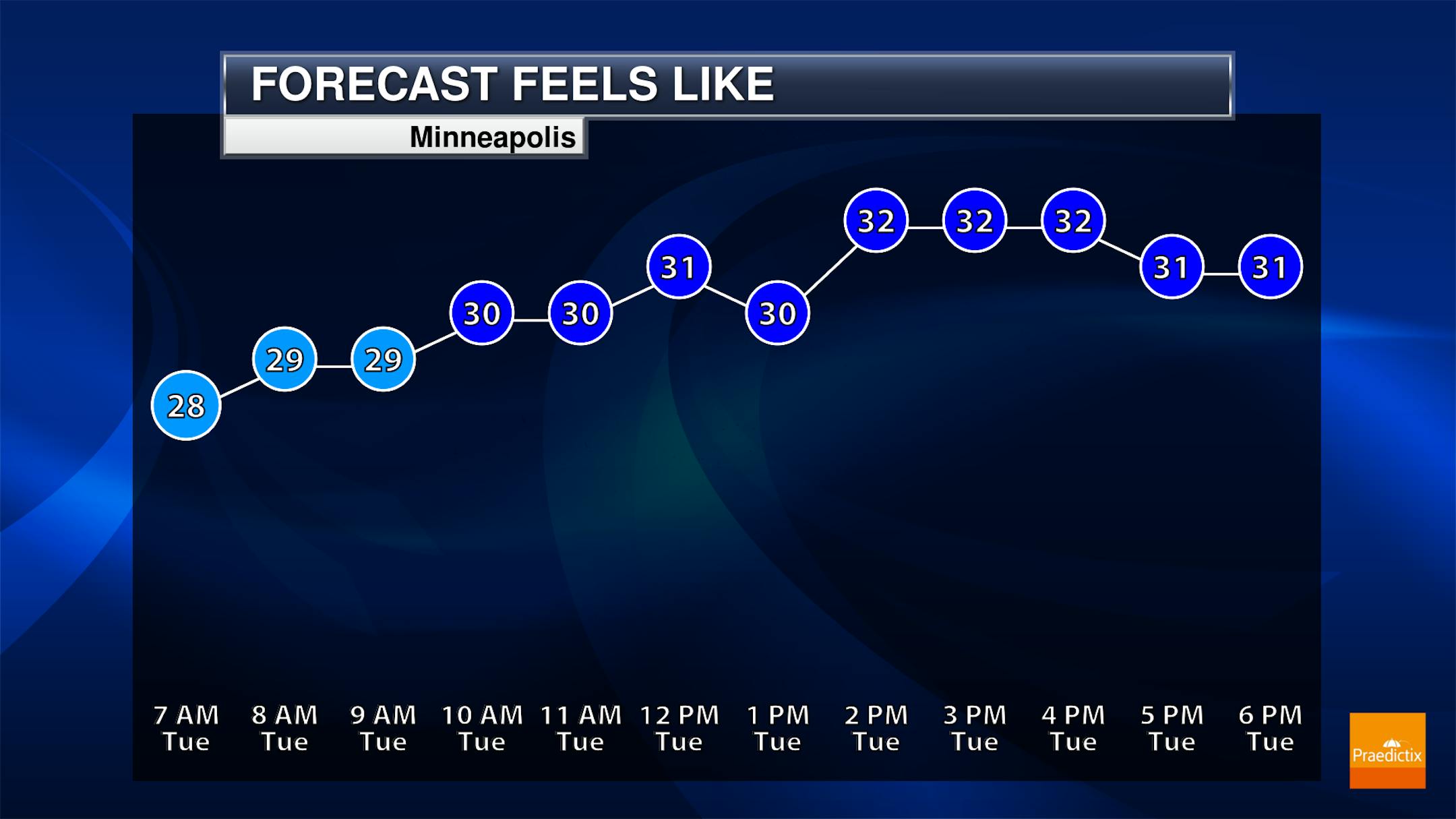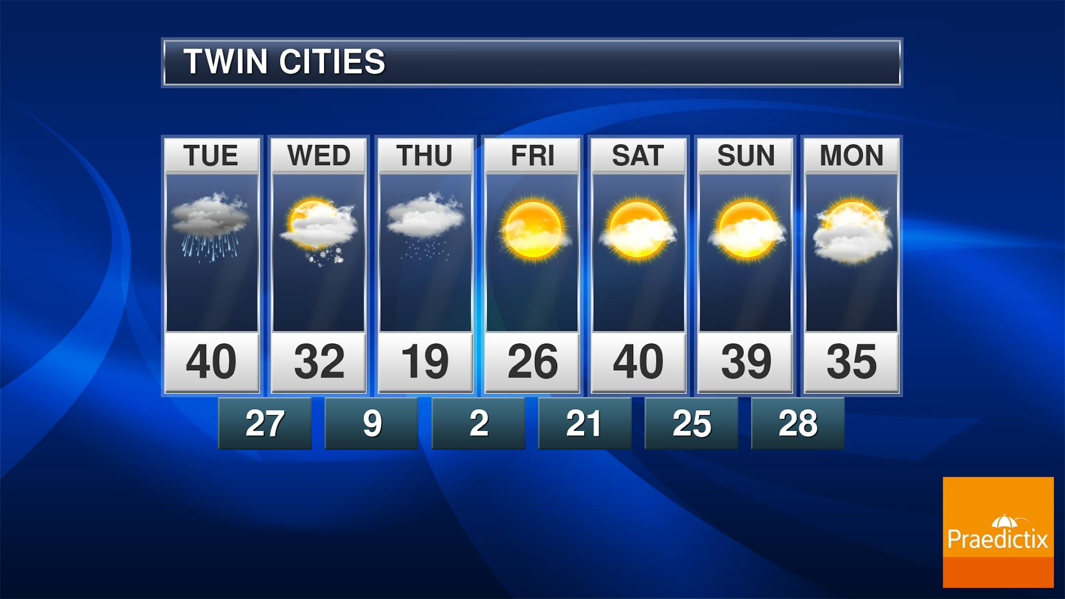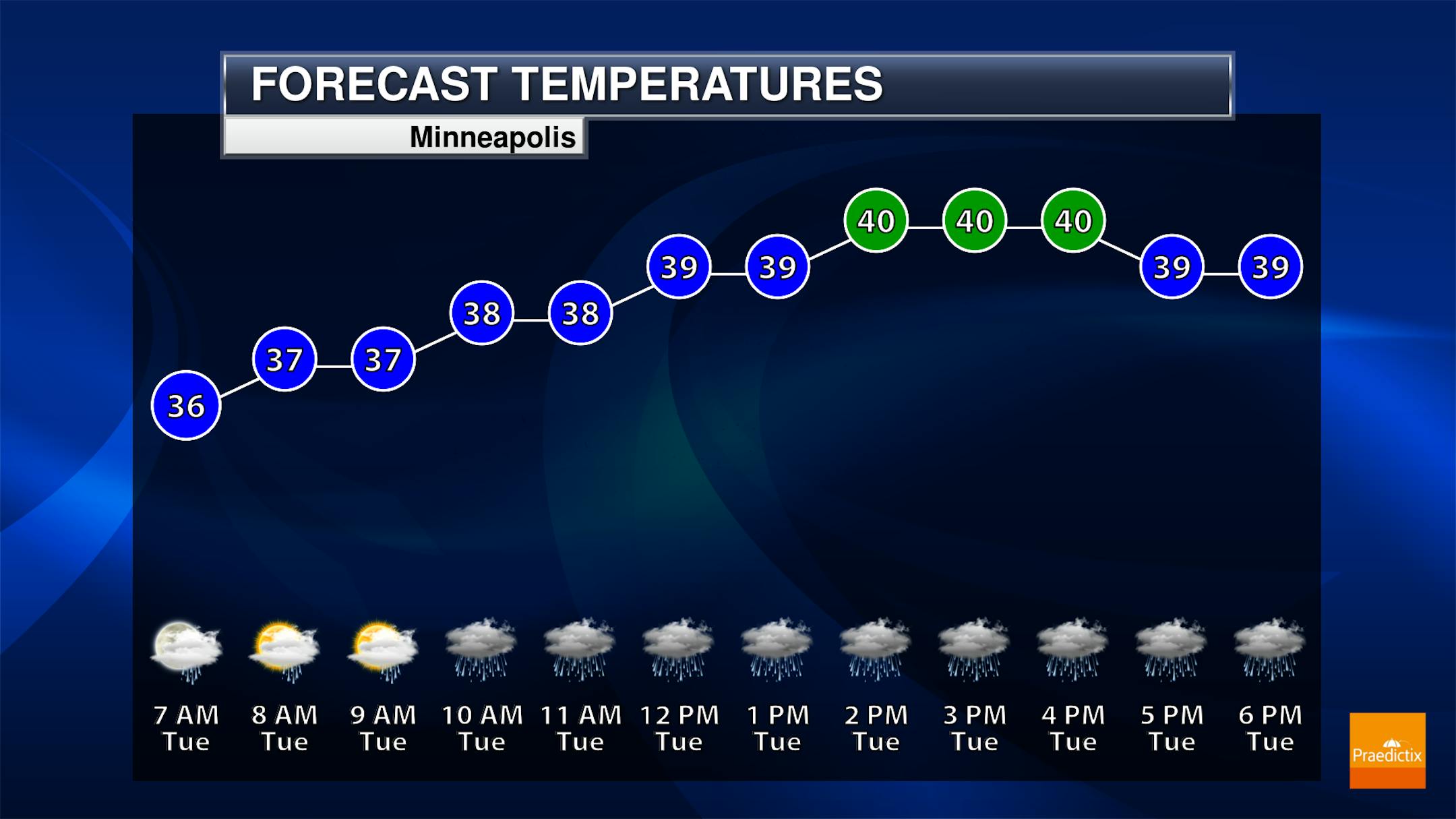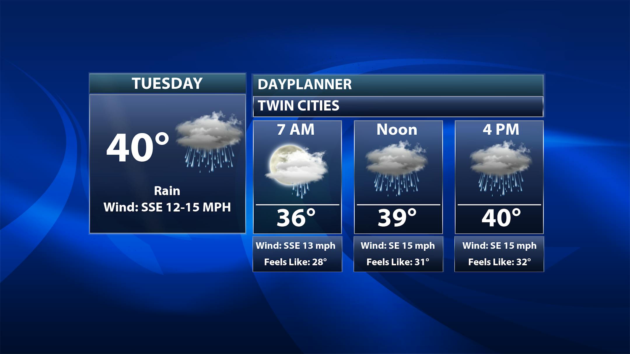 The weather on Tuesday will be quite soggy across the region with rain moving in around midday and continuing through much of the afternoon/evening. Temperatures farther north and west will be cold enough for snowfall, which could add up to a few inches of snow by AM Wednesday. A light coating of snow will be possible in the Twin Cities by early AM Wednesday.