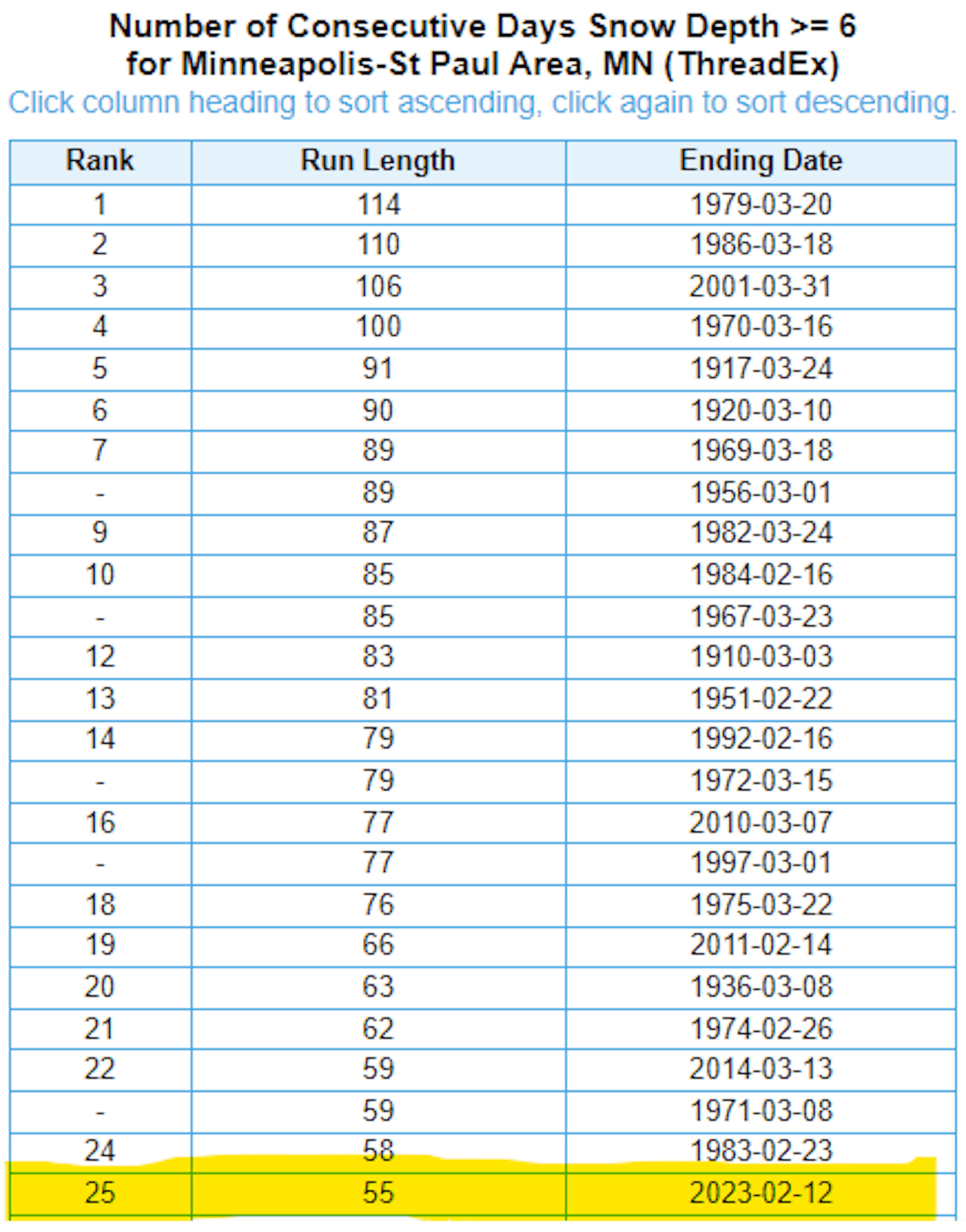 Believe it or not, the MSP Airport is currently sitting at its 25th longest consecutive stretch of at least 6" of snow on the ground. There has been at least 6" of snow on the ground since December 20th with the maximum snow depth at 16" on January 5th & 6th. With warmer weather continuing through the middle part of next week, the snow pack will continue to dwindle. By the way, this is the longest stretch of at least 6" of snow since 2014 (1/14 to 3/13), that was a 59 day day stretch.