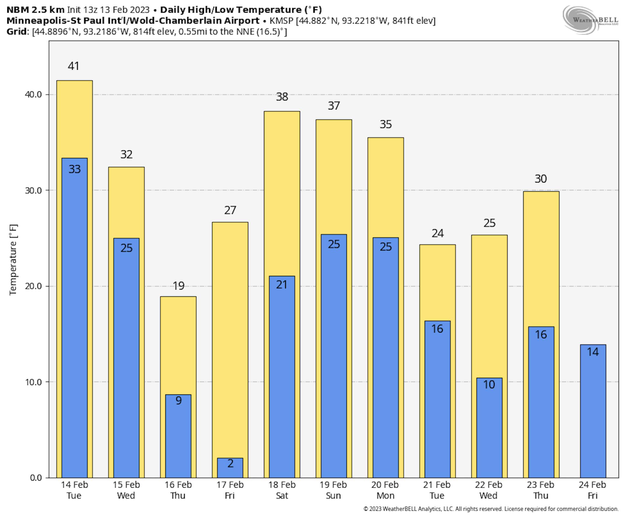 The NBM extended temperature outlook for Minneapolis keeps milder weather in place over the next several days with highs warming into the 30s to near 40F. It looks like warmer than average weather sticks around through midweek before a brief cool stint moves in later this week with highs in the 10s and 20s. Again, it won't be too cold and it won't last long. Highs be next weekend look to warm into the 30s once again.