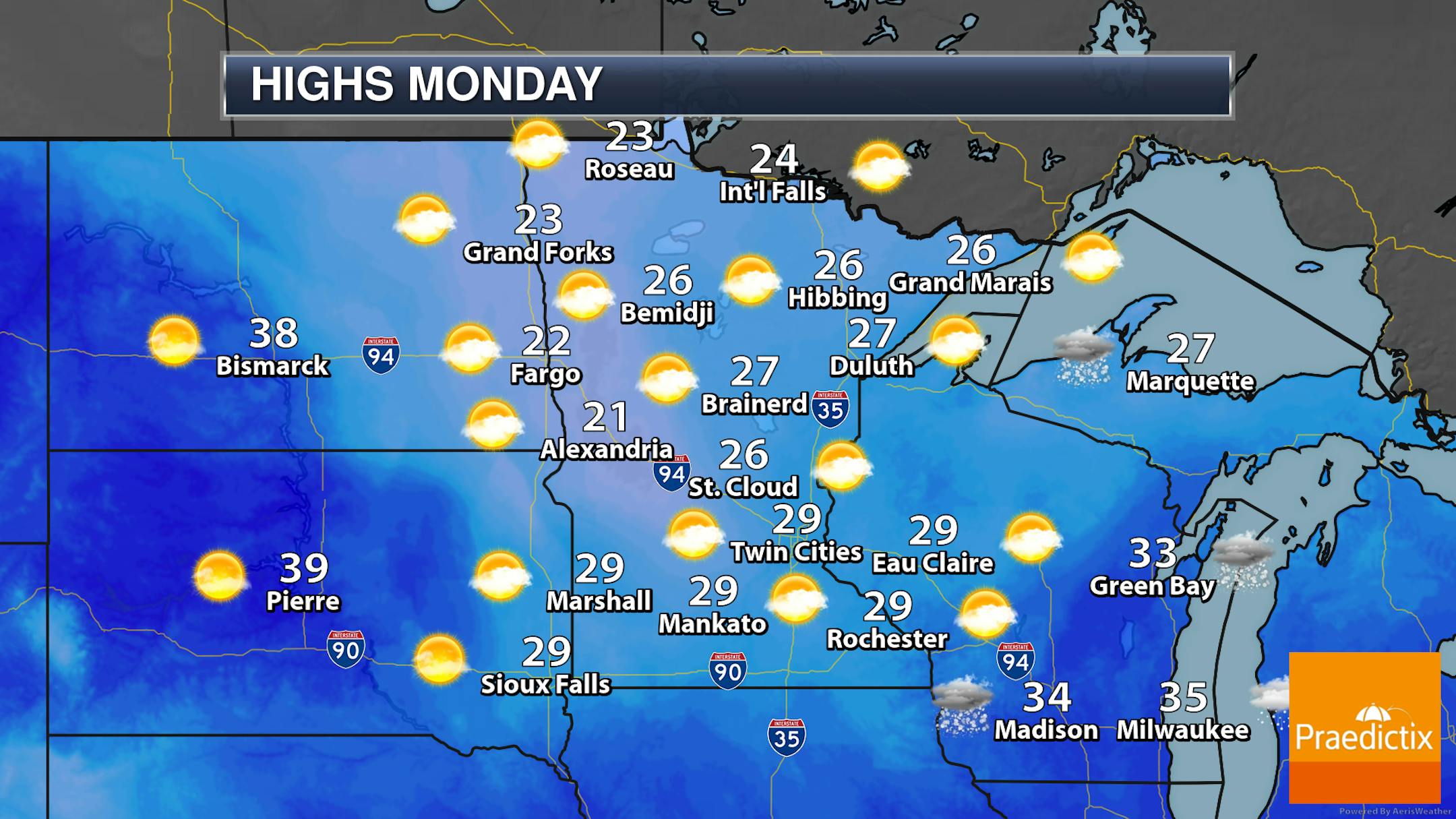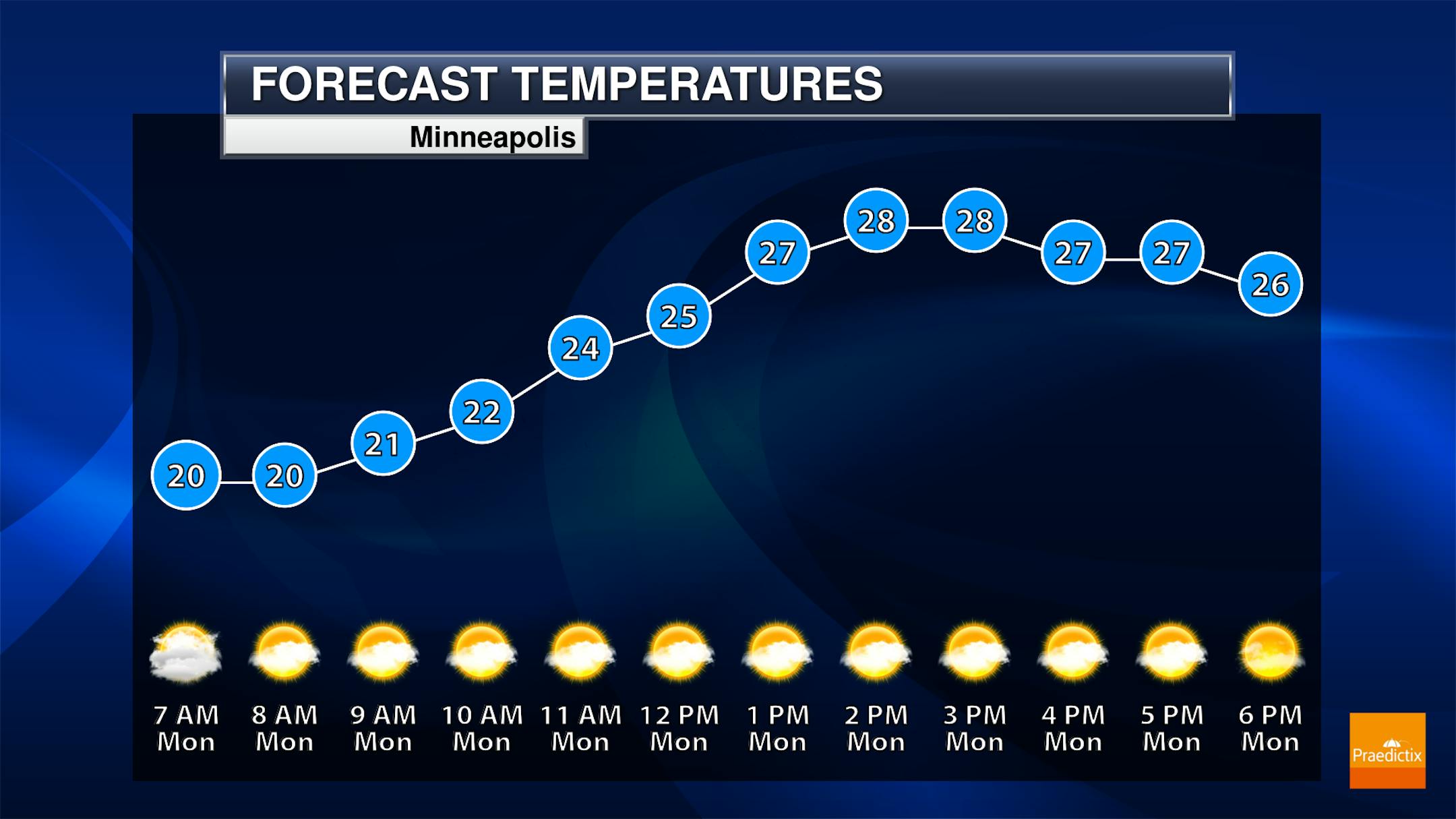 A calm and partly sunny Monday is ahead here in the Twin Cities with highs starting off in the low 20s and only climbing to the upper 20s for highs.