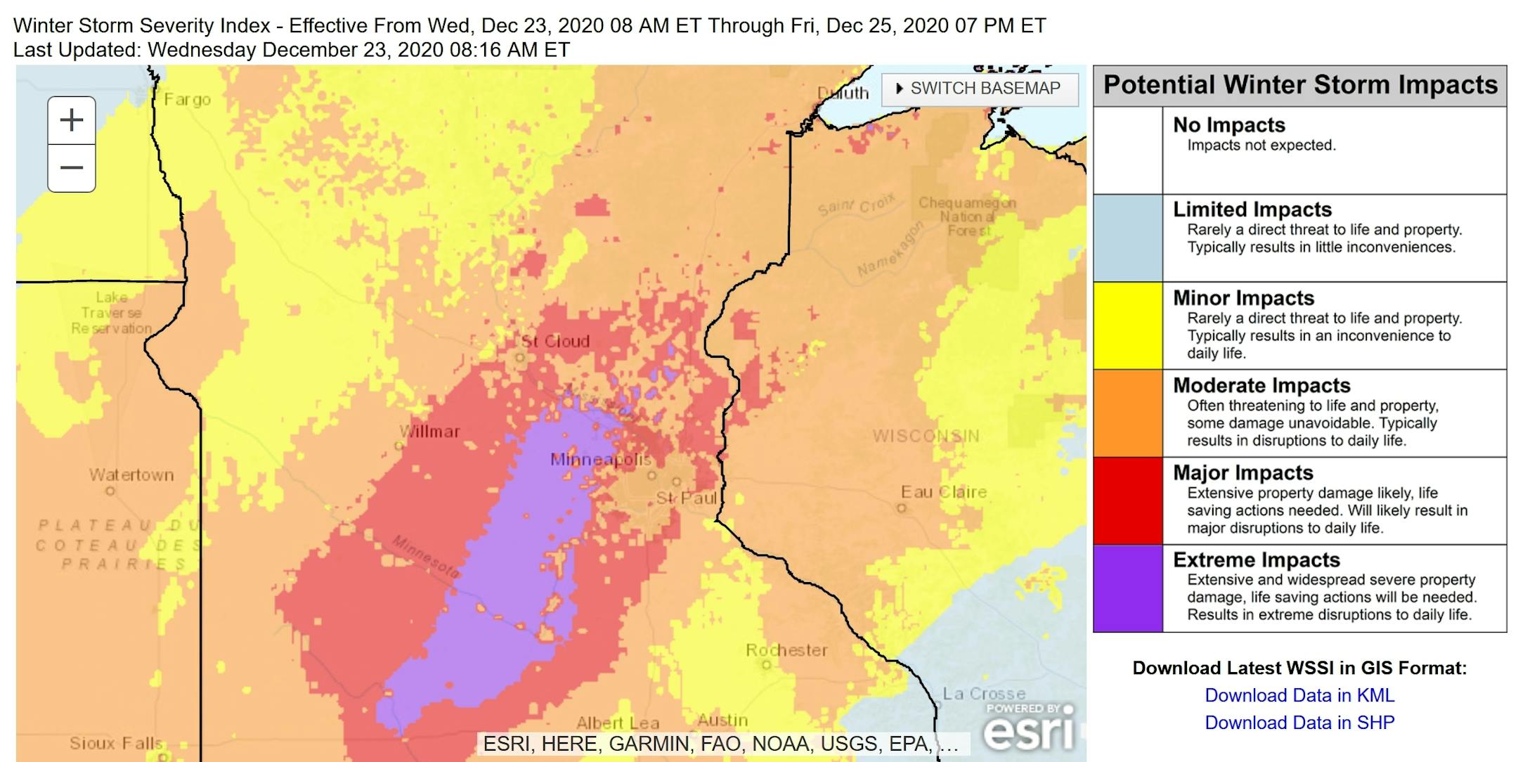 NOAA: Major to Extreme Impacts. Factoring winds, ice and blizzard conditions developing this afternoon the National Weather Service is raising the possibility of extreme impacts, especially west metro, roughly Mankato to Elk River. Travel may become treacherous to impossible during the afternoon and evening hours. Take it easy out there.