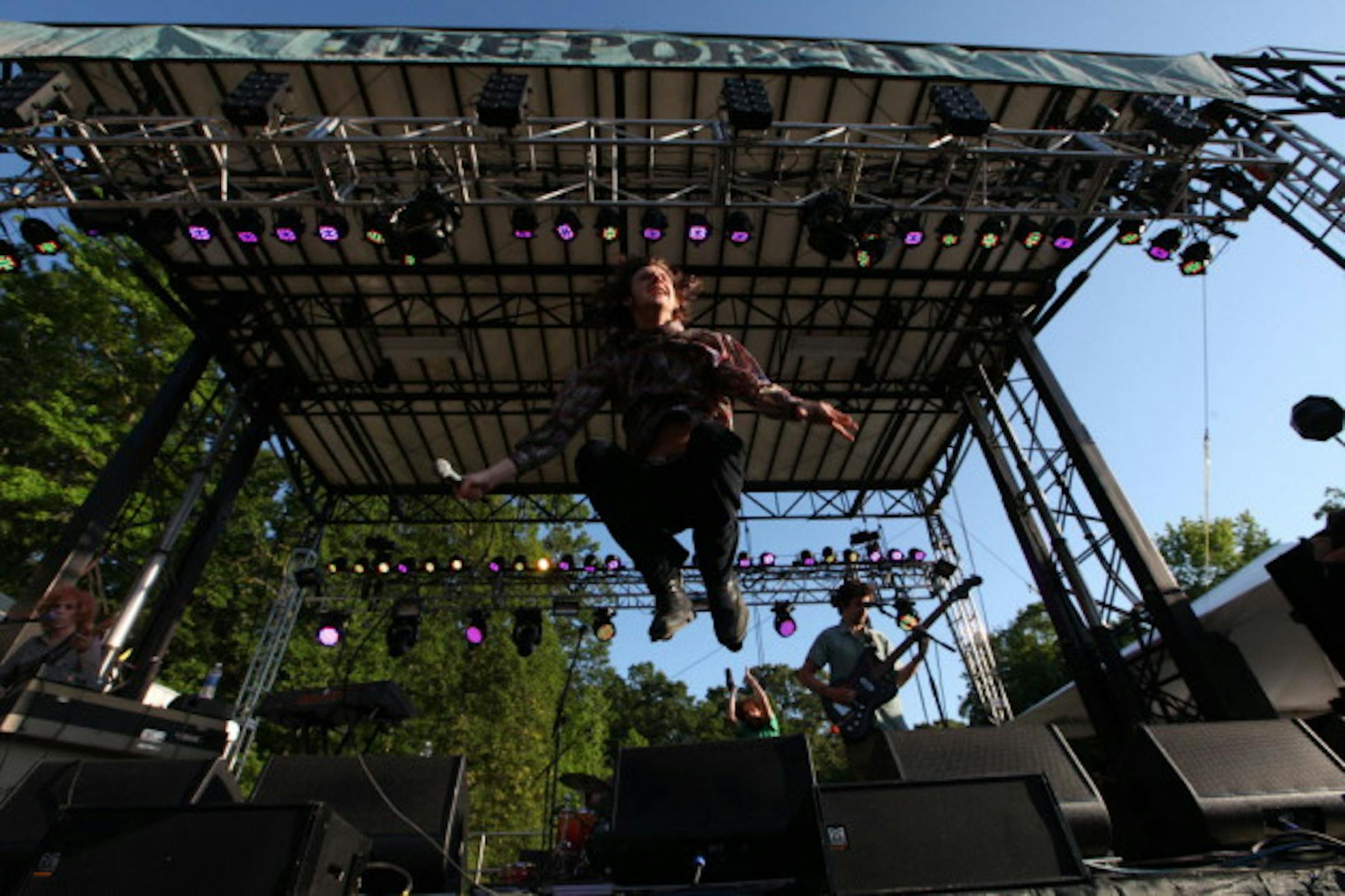 He "attempted to jump up on one of the monitors at the front of the stage and his momentum ended up causing the monitor to tip over which sent him flying down into the pit," reported concertger Chris Dumpert.