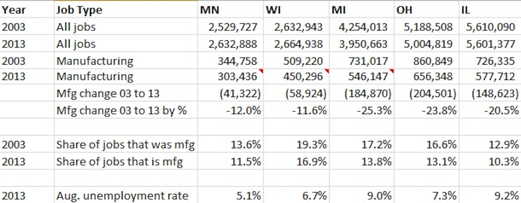 It's worth mentioning here that Minnesota's GDP has been and continues to be greater than Wisconsin's, even though slightly fewer people have jobs here. And in manufacturing, Minnesota's annual output grew by 30 percent from 2003 to 2012, even though employment fell 12 percent.
