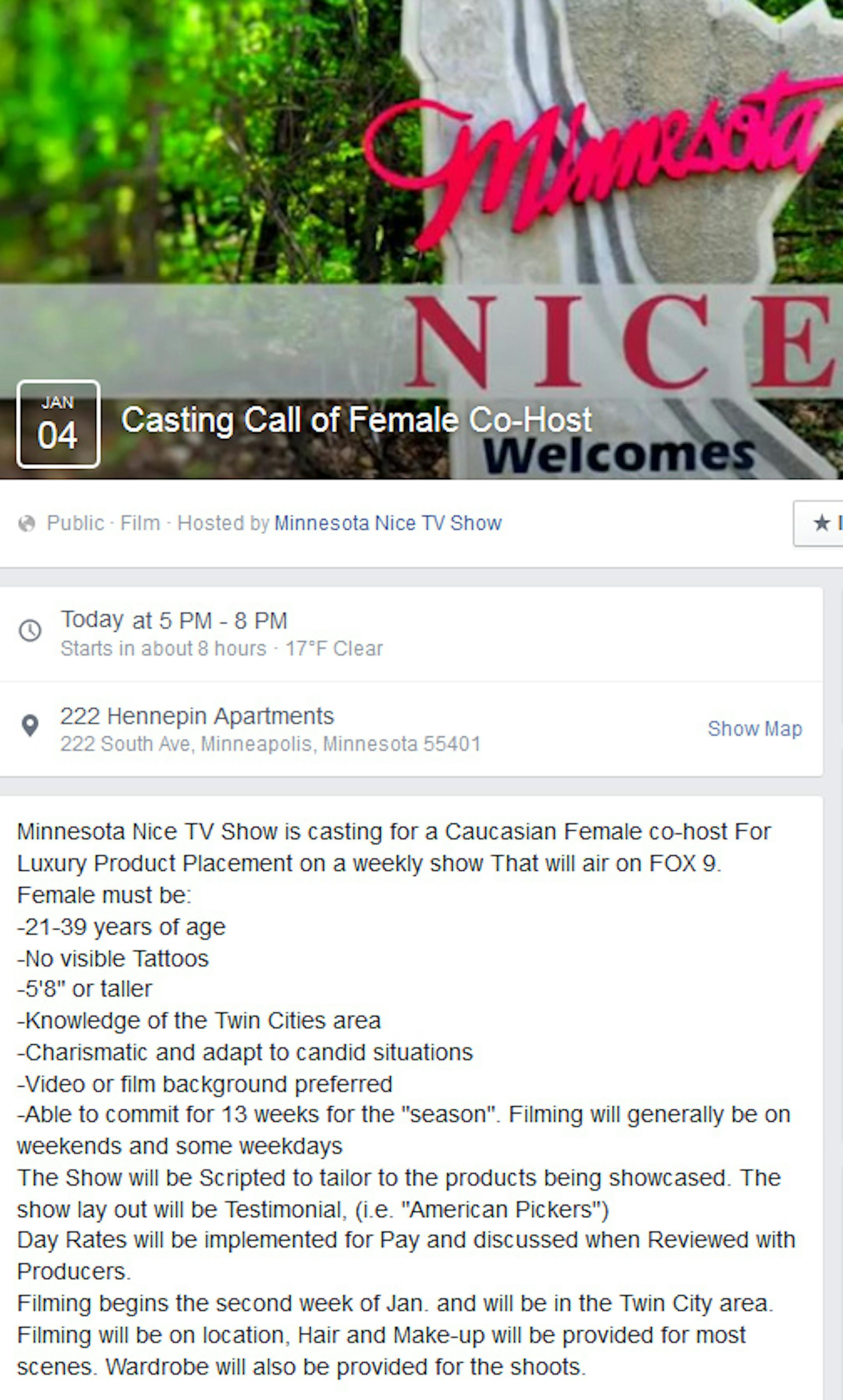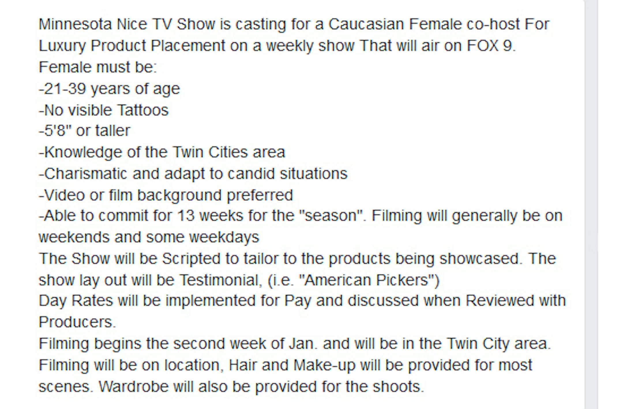 Producers for an upcoming series posted a casting call Monday on Facebook for a position co-hosting a program centered around "luxury product placement." The notice requested a Caucasian female that's 5'8" or taller and has no visible tattoos. The word "Caucasian" was dropped from the posting after several people responded with concerns.The post was pulled all together in the afternoon.