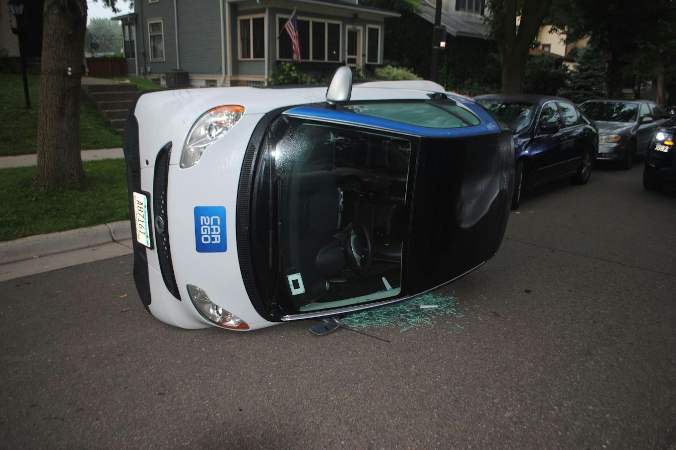 Officers were called to the area of Finn Street and St. Clair Avenue around 11:30 p.m. Saturday on a report that one of the car sharing company's light-blue-and-white Smart Fortwo cars was "being tipped over by juveniles." The male suspects fled the scene in a tan or gold SUV-style vehicle, according to a police report.