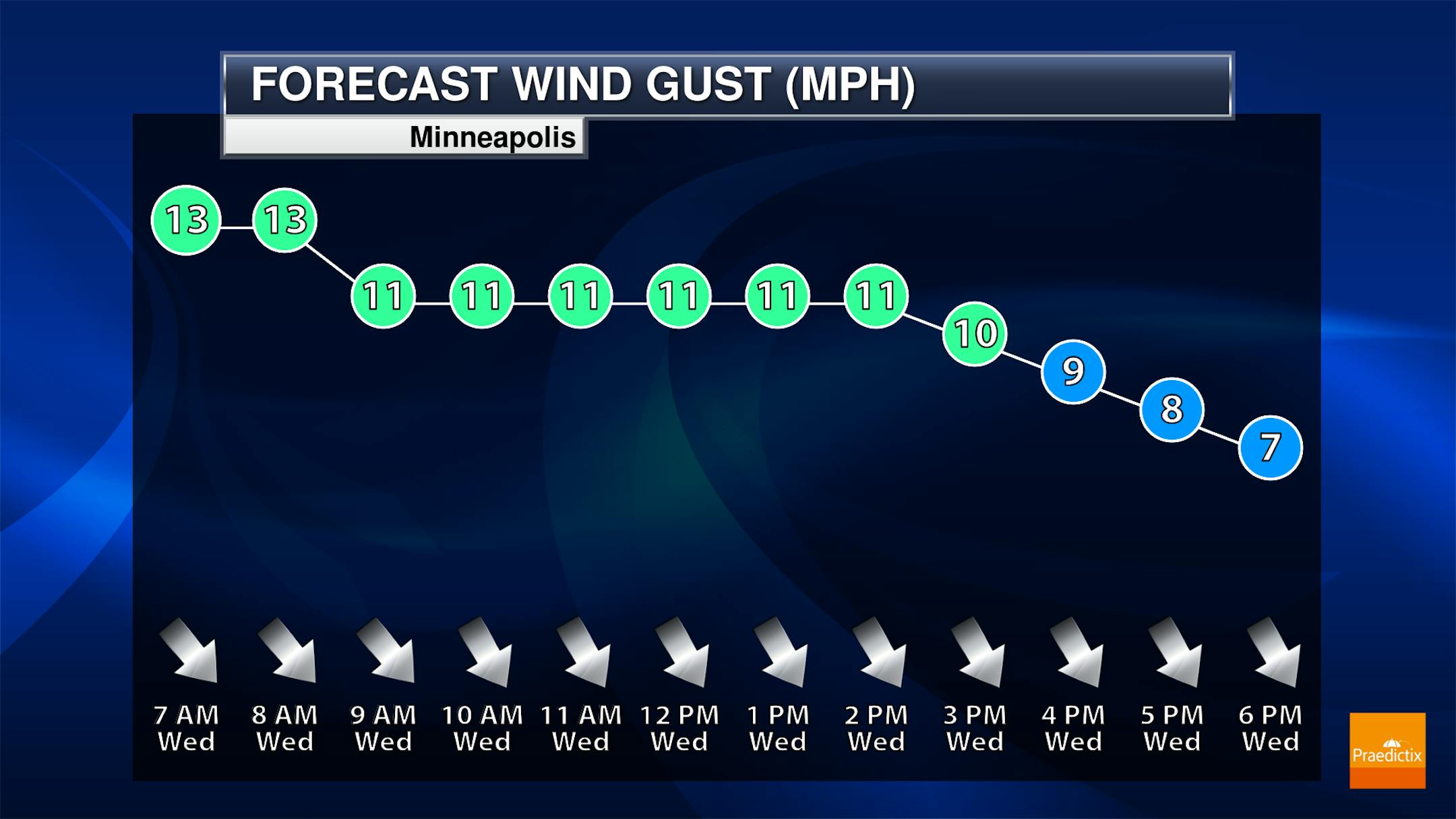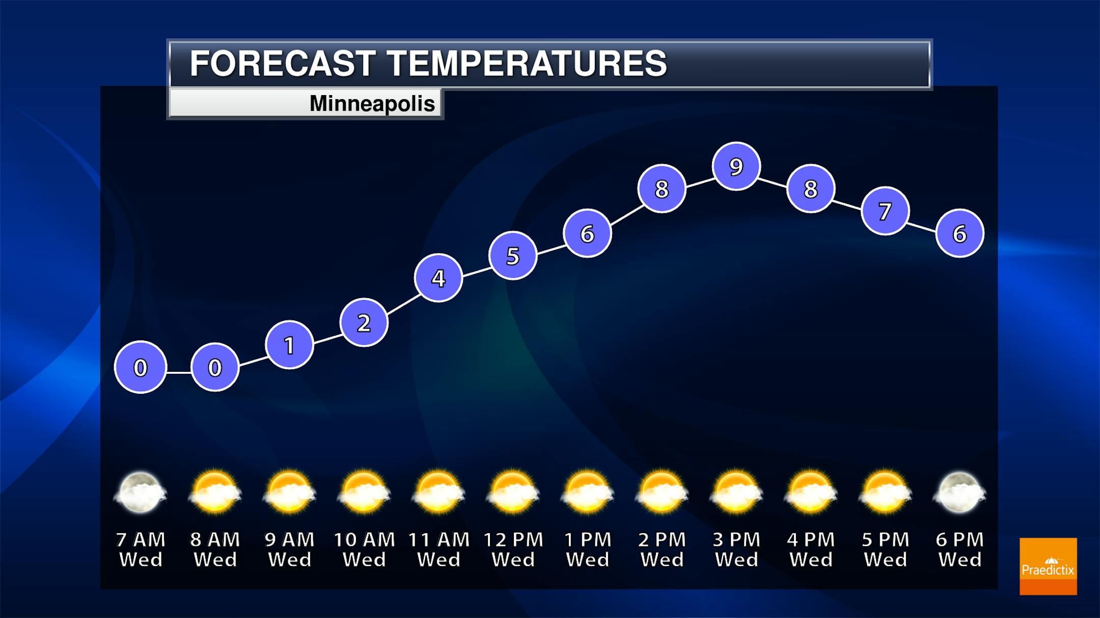 The hourly temps for Minneapolis on Wednesday show temps starting around 0F in the morning and topping out around 10F in the afternoon under mostly sunny skies. NW winds will be anywhere from 10mph to 15mph making it feel even colder during the day.