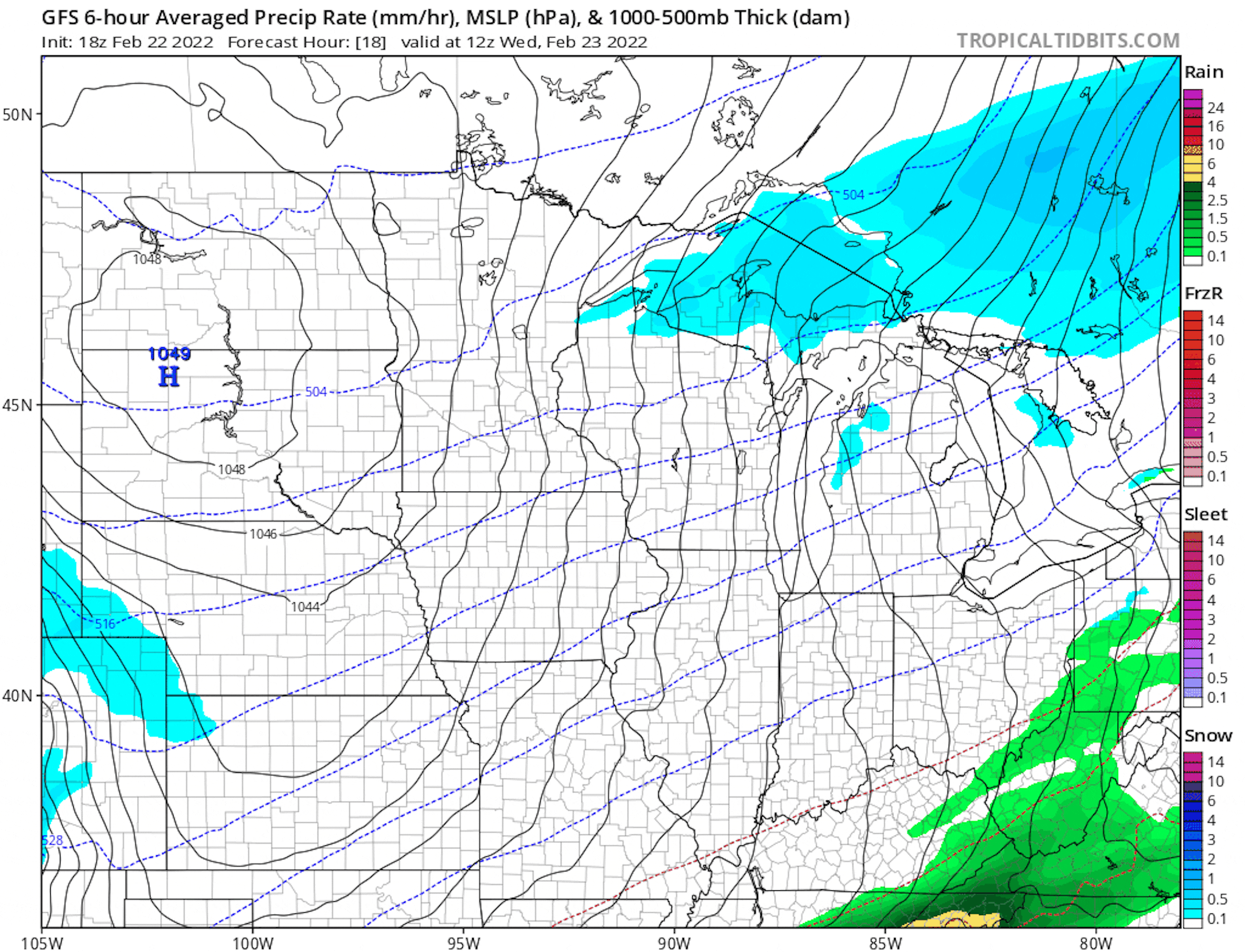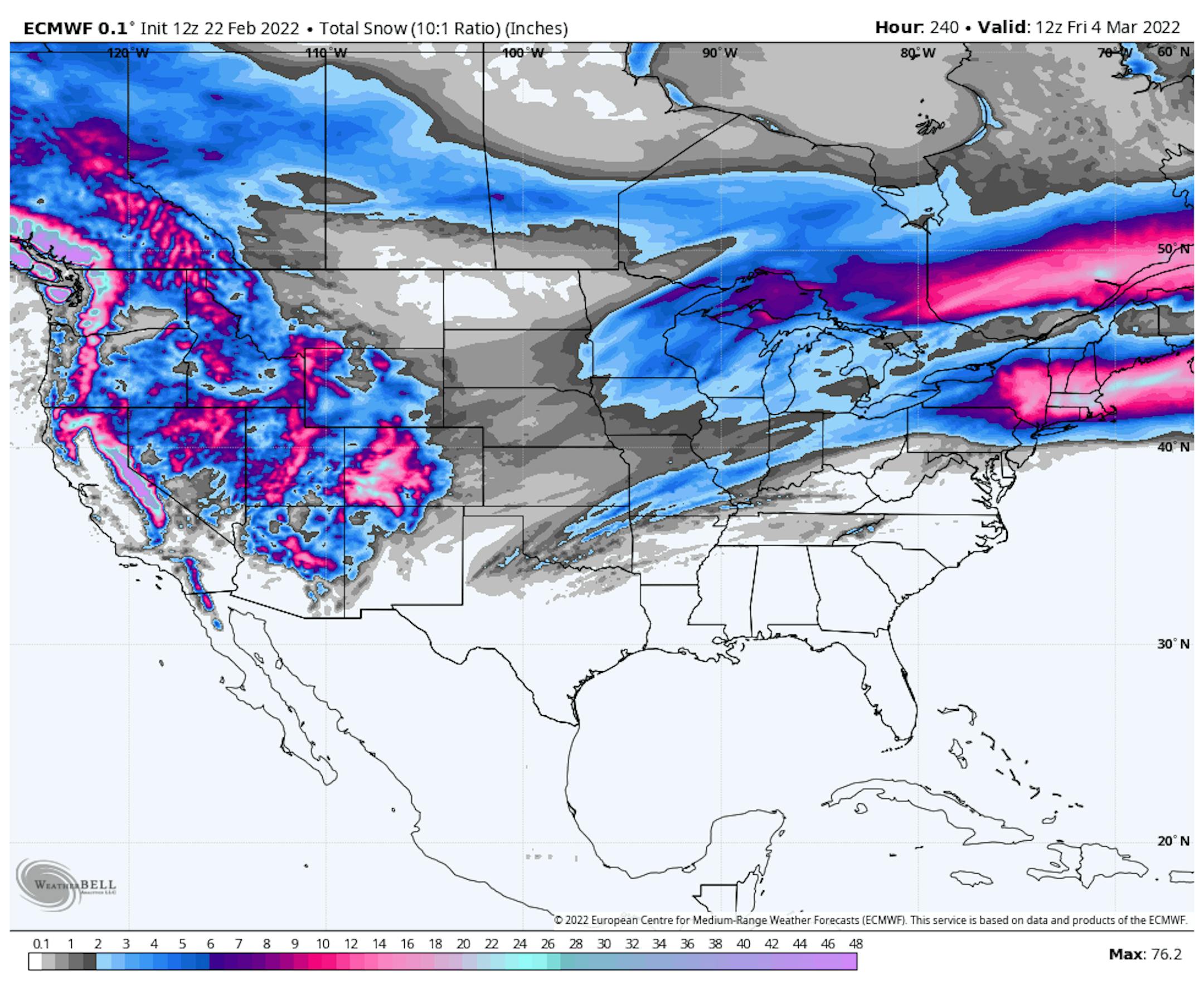 The extended weather outlook through the week ahead shows cold temps in place over the next 5 to 7 days. There will be a chance of light snow on Thursday with the warmest day on Saturday as highs approach 30F.