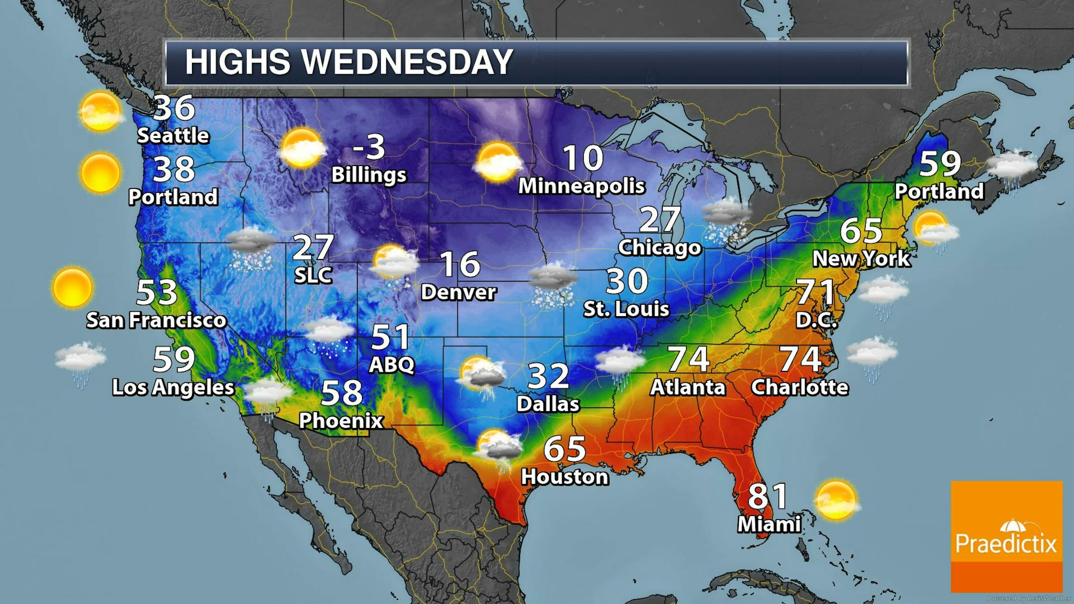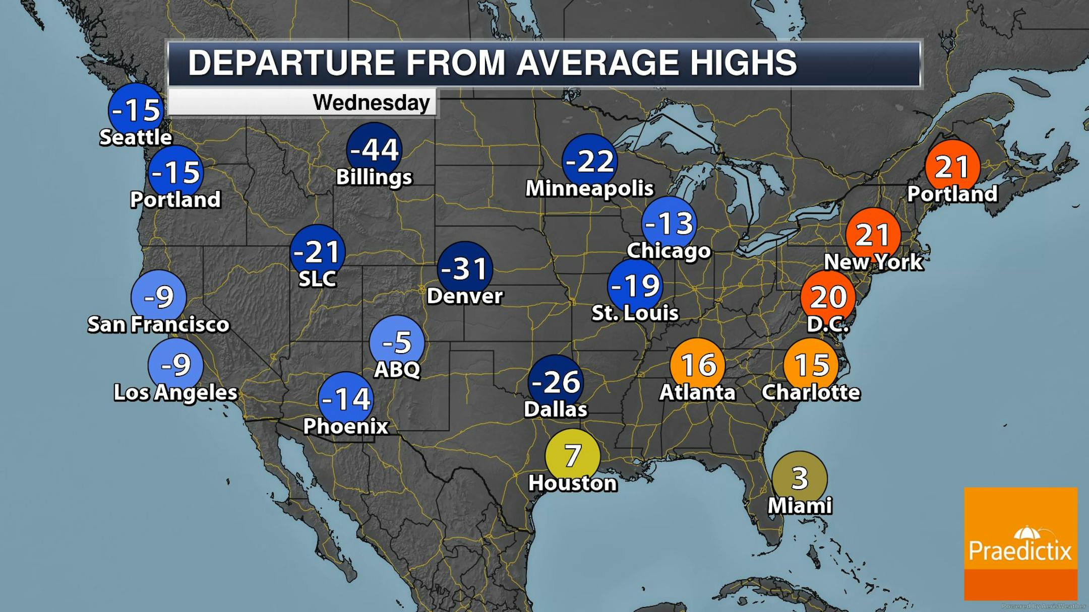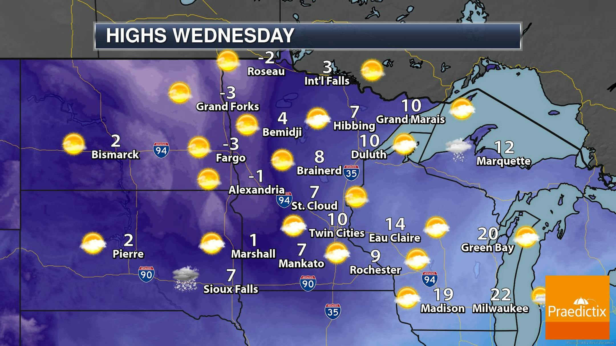 Wednesday will be another cold day with temps running nearly -20F to -30F below average across the region. Highs will be so cold that record cold high temps will be possible for some across the eastern Dakotas.