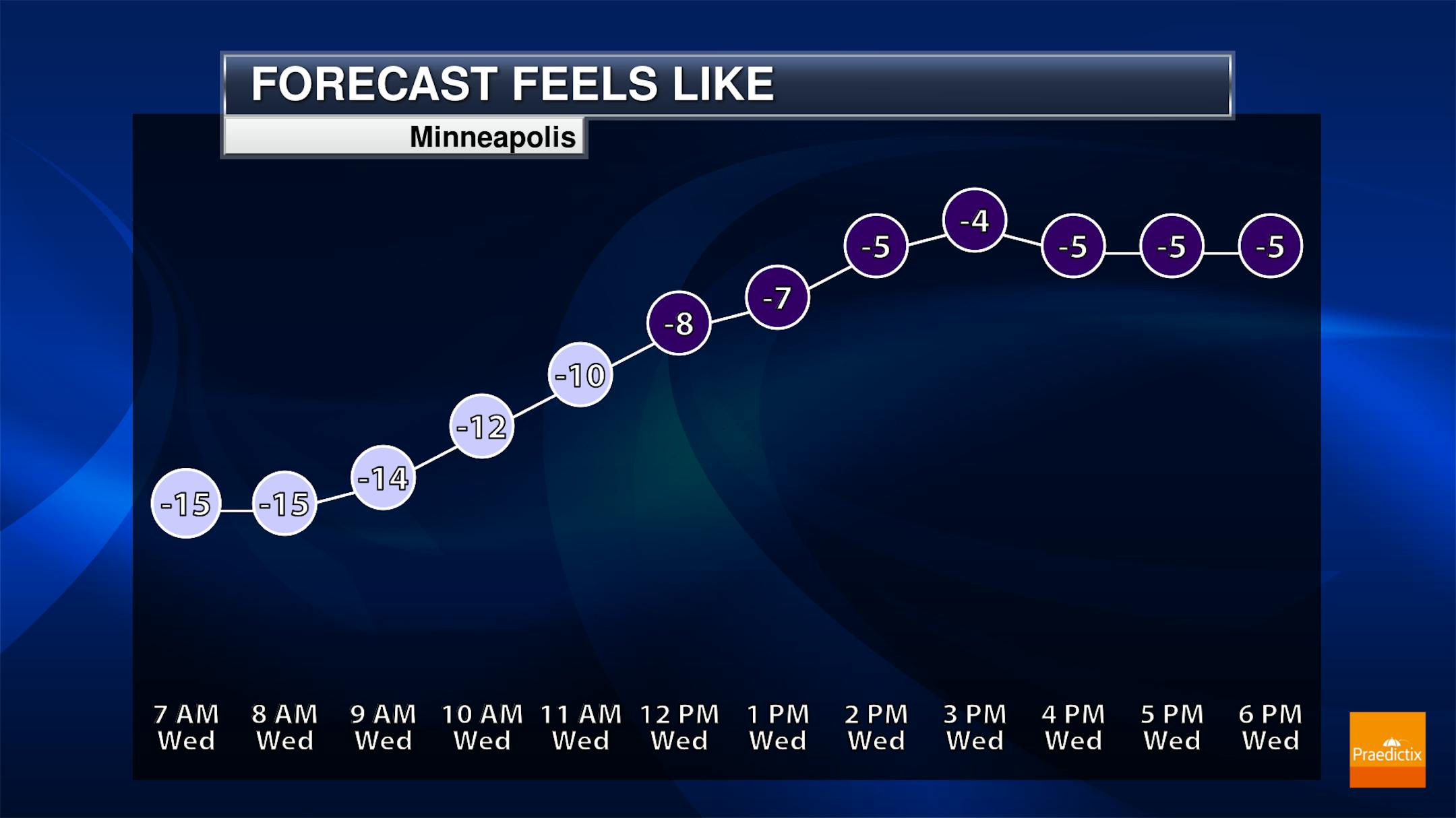 Feels like temps for Minneapolis on Wednesday will be in the sub-zero range all day with readings starting in the teens below zero and will warm into the single digits below zero by the afternoon.