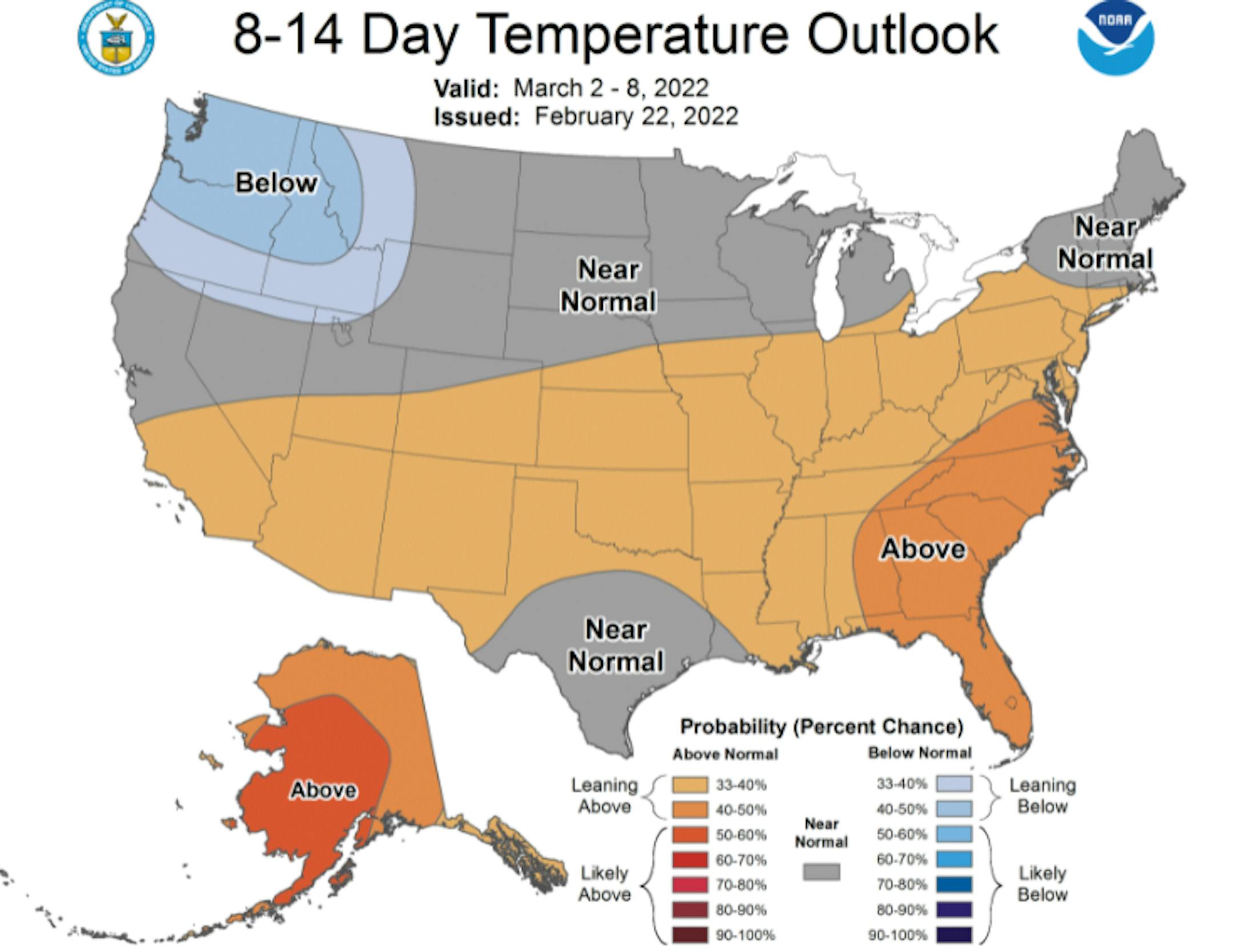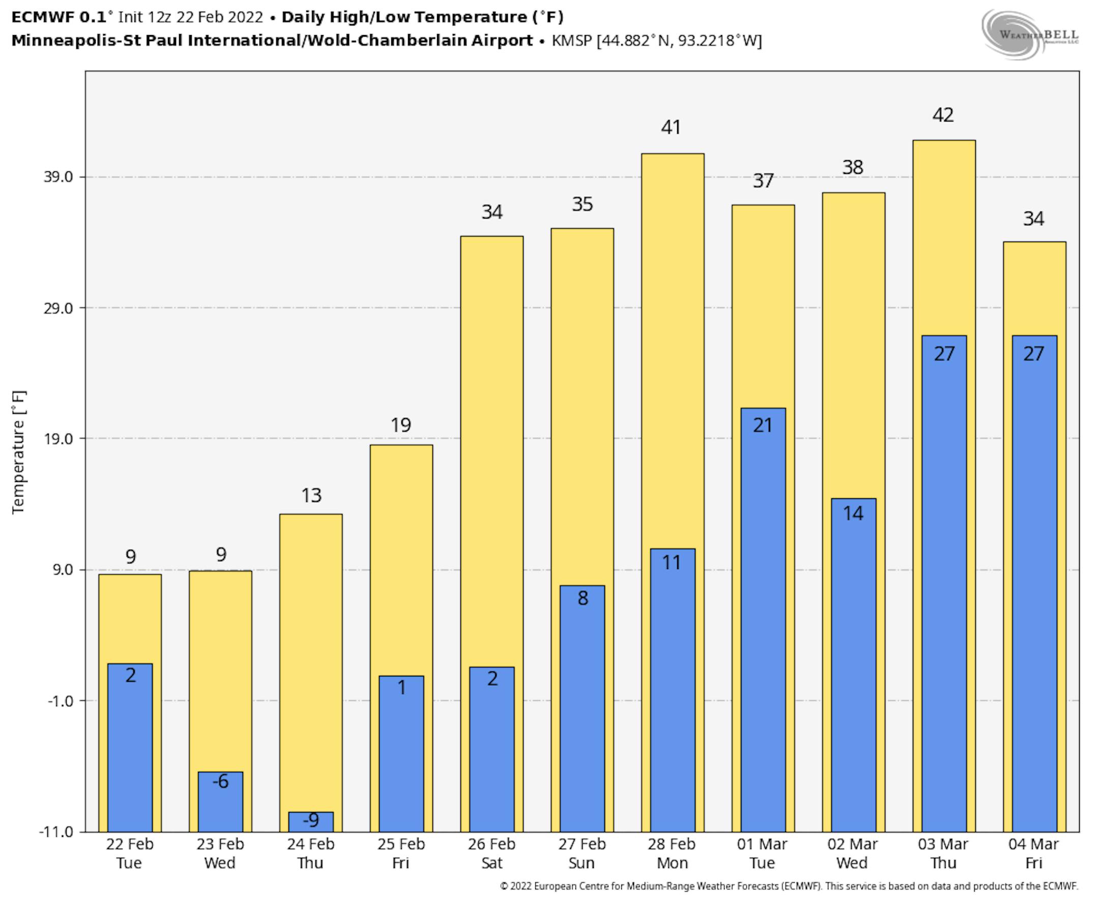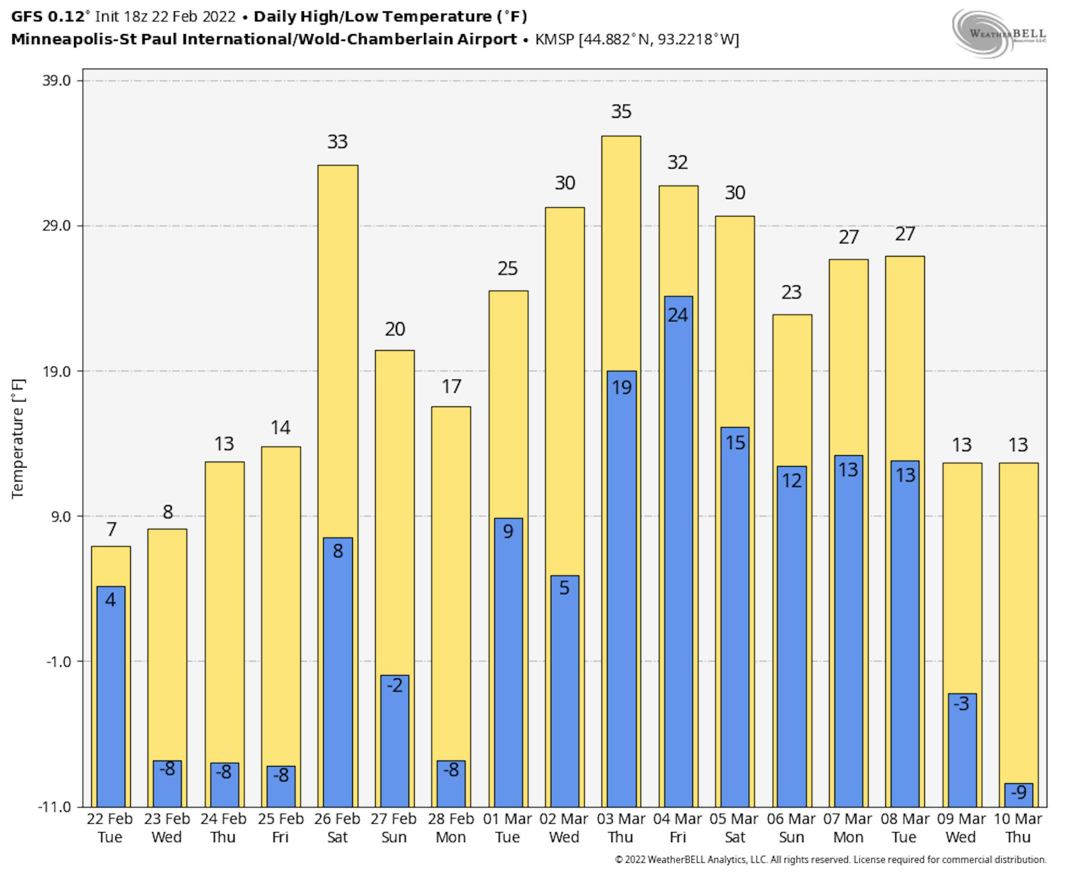 The extended temperature outlook for Minneapolis over the next several days shows well below average temps in place through the week ahead. The last few days of February will be running nearly -10F to -20F below average.