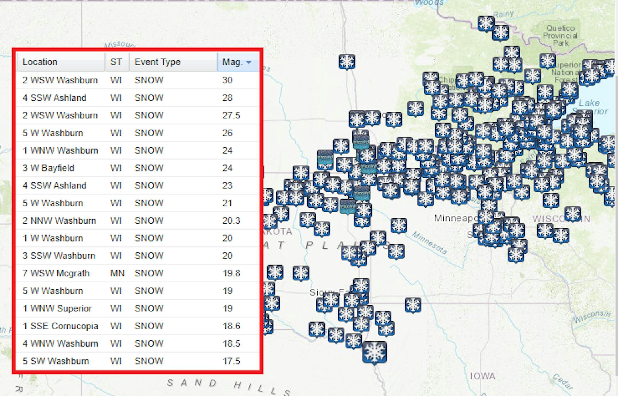 Here are some of the heaviest snowfall reports from Monday. Note the near 30" reports coming in from Washburn, WI. There was also a 20" report from Mcgrath located near Duluth, MN.
